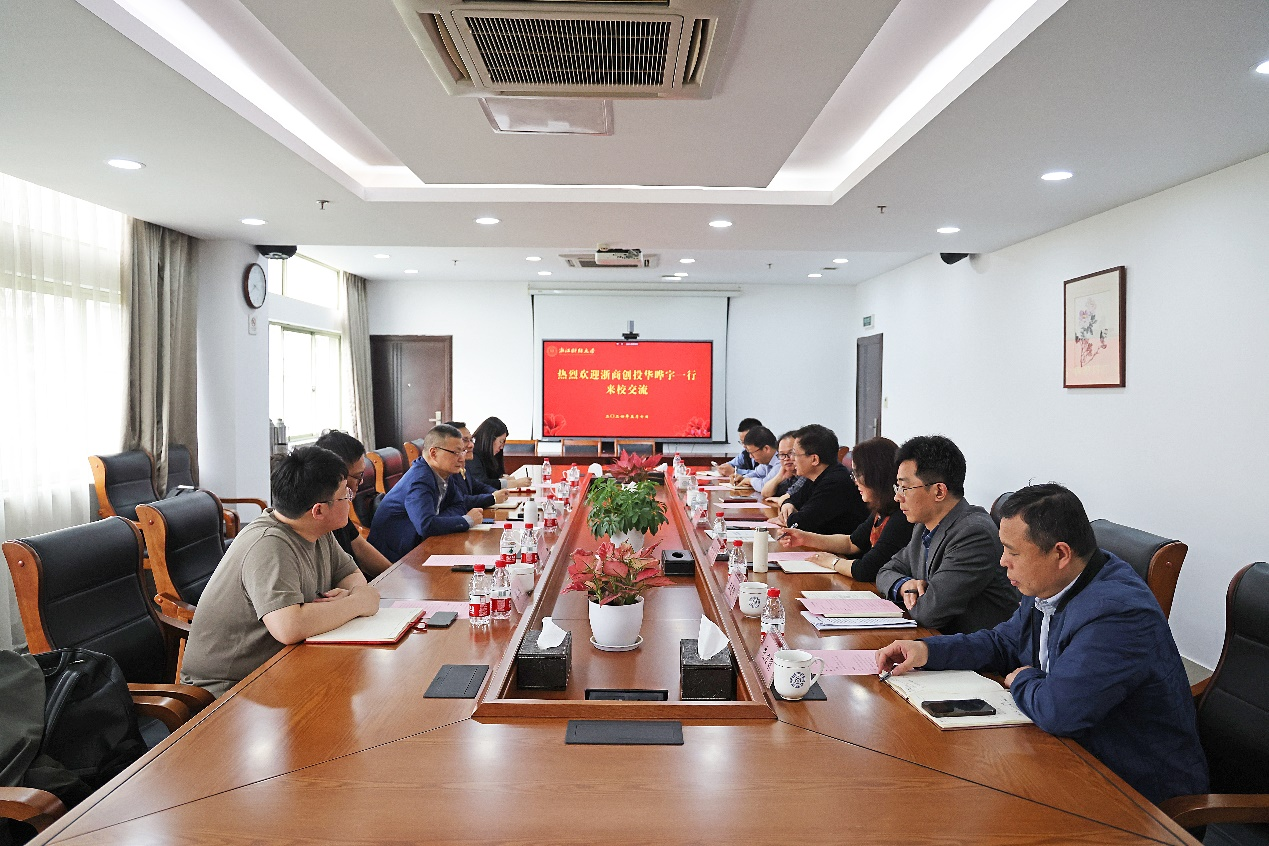 本网讯5月7日,浙商创投股份有限公司创始合伙人华晔宇、省中小企业协会上市公司专委会执行理事长兼秘书长沈松华等一行来我校交流座谈。校党委副书记、副校长(主持行政工作)魏江热情接待了来访客人,郑亚莉副校长陪同参加座谈。