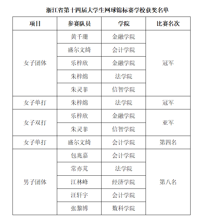 学校共派出10名运动员参赛,在领队徐家伟、教练罗旭的指导下,在女子团体赛中以小组第一的成绩出线,先后战胜了浙江大学、中国美术学院、浙江外国语学院、浙江中医药大学,荣获冠军;在女子单打项目中,朱梓绵一路披荆斩棘,在决赛中大比分获得冠军;在女子双打项目中,朱灵菲、乐梓欣四进二拖到抢七,最终夺得第二名。全体参赛运动员和教练员在比赛中发扬坚韧不拔、勇攀高峰的拼搏精神,充分展示了我校竞技体育的良好成果。