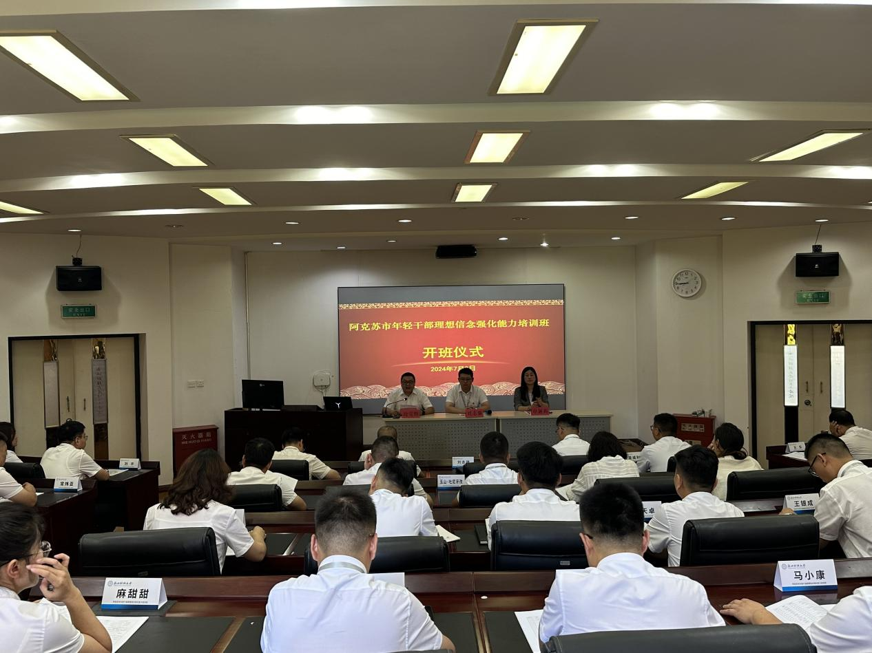 本网讯7月8日,由阿克苏市委组织部主办的阿克苏市年轻干部理想信念强化能力培训班在文华校区举行。阿克苏市委宣传部常务副部长刘志强,校党委委员、组织部部长、统战部部长申屠莉出席开班仪式并讲话。