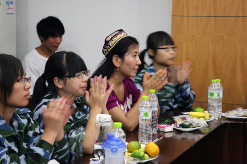 茶话会上,学校为同学们准备了盒饭,师生一起吃团圆饭,其乐融融。老师和同学们用新疆歌舞、诗歌朗诵等节目营造出浓郁的节日氛围,将活动气氛推向了高潮,快乐的笑容洋溢在每一个人的脸上。