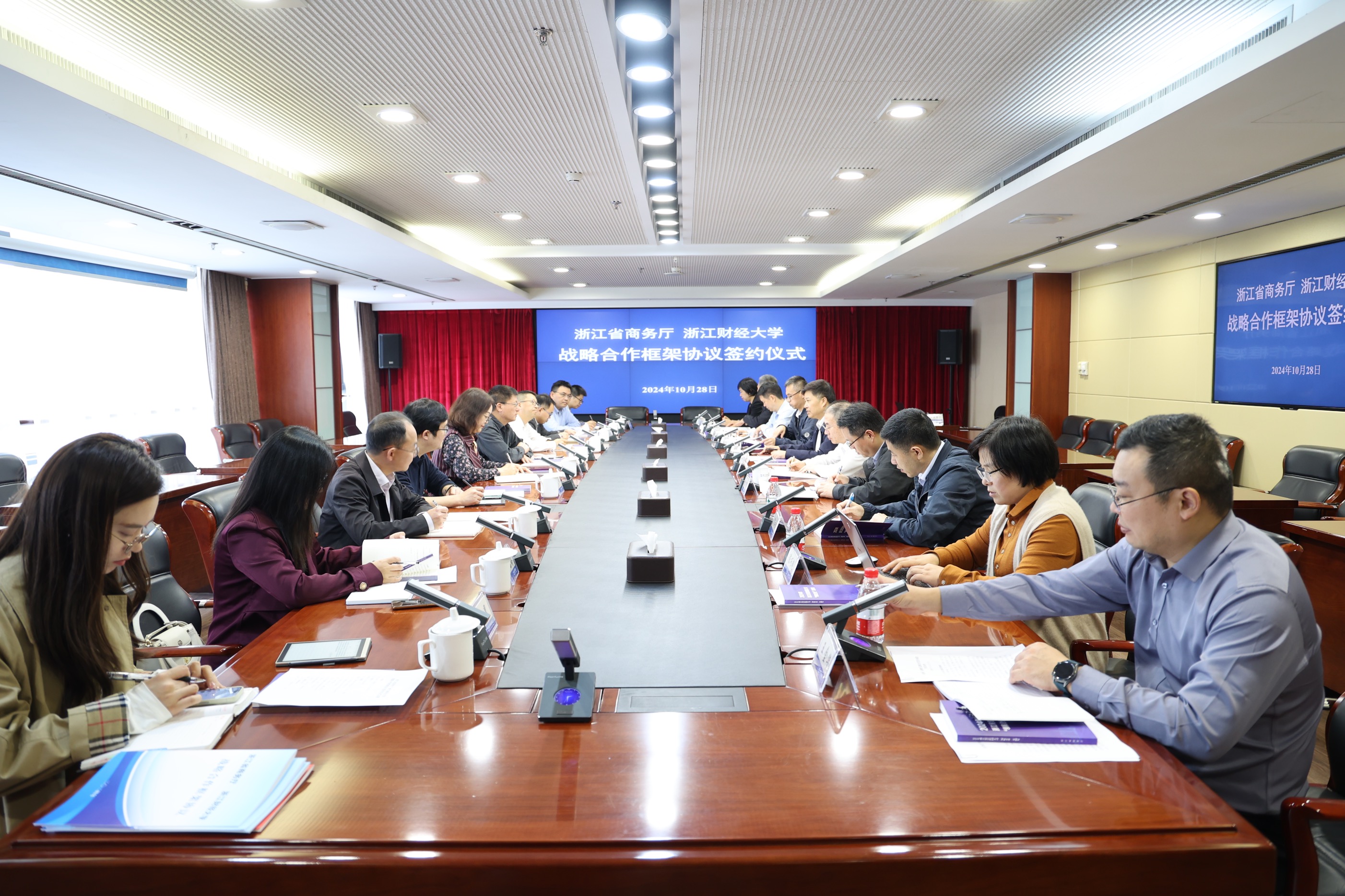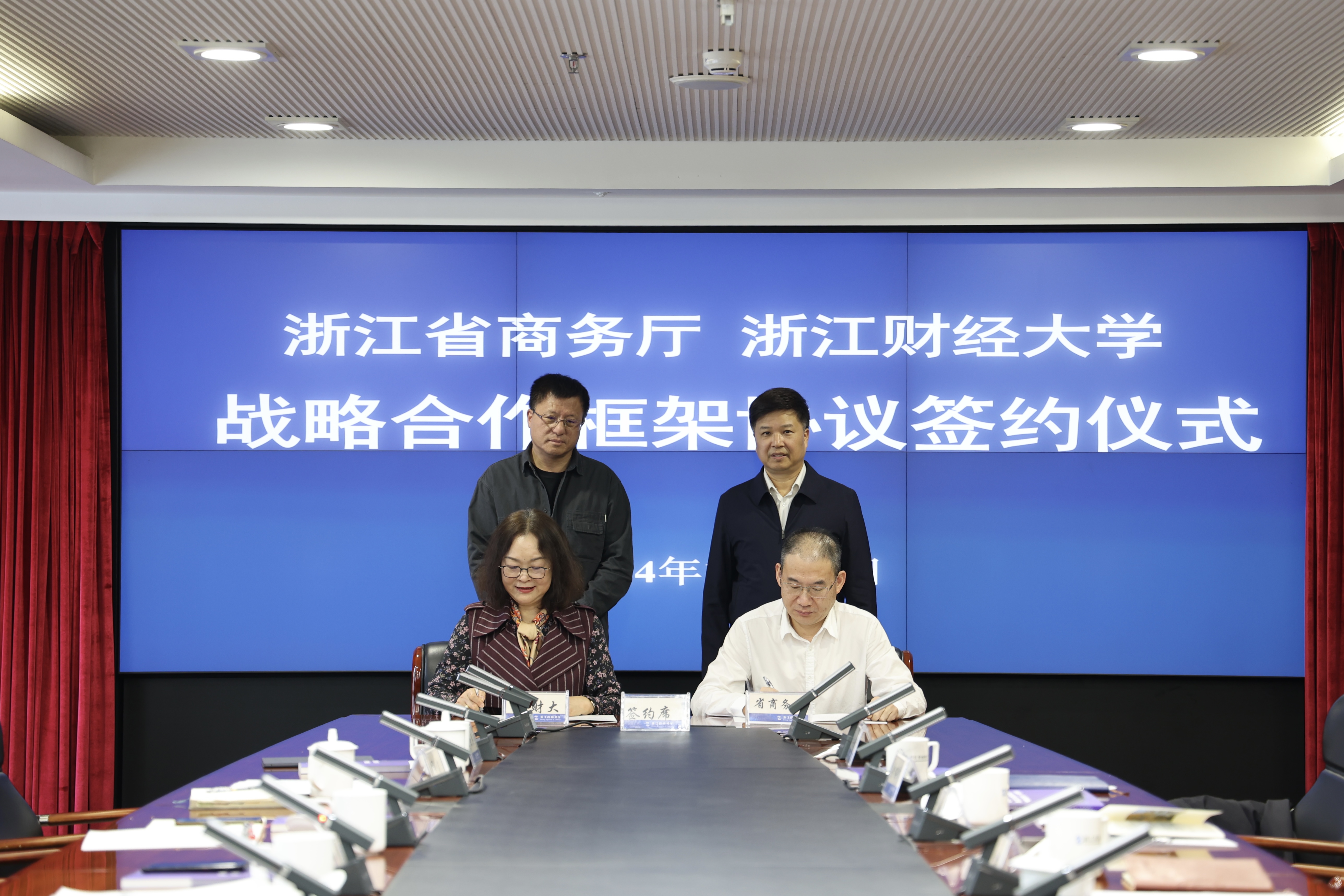 本网讯10月28日,学校与浙江省商务厅举行战略合作签约仪式。省商务厅党组书记、厅长韩杰,党组成员、总经济师朱军,校党委副书记、校长魏江,副校长郑亚莉等领导出席仪式。