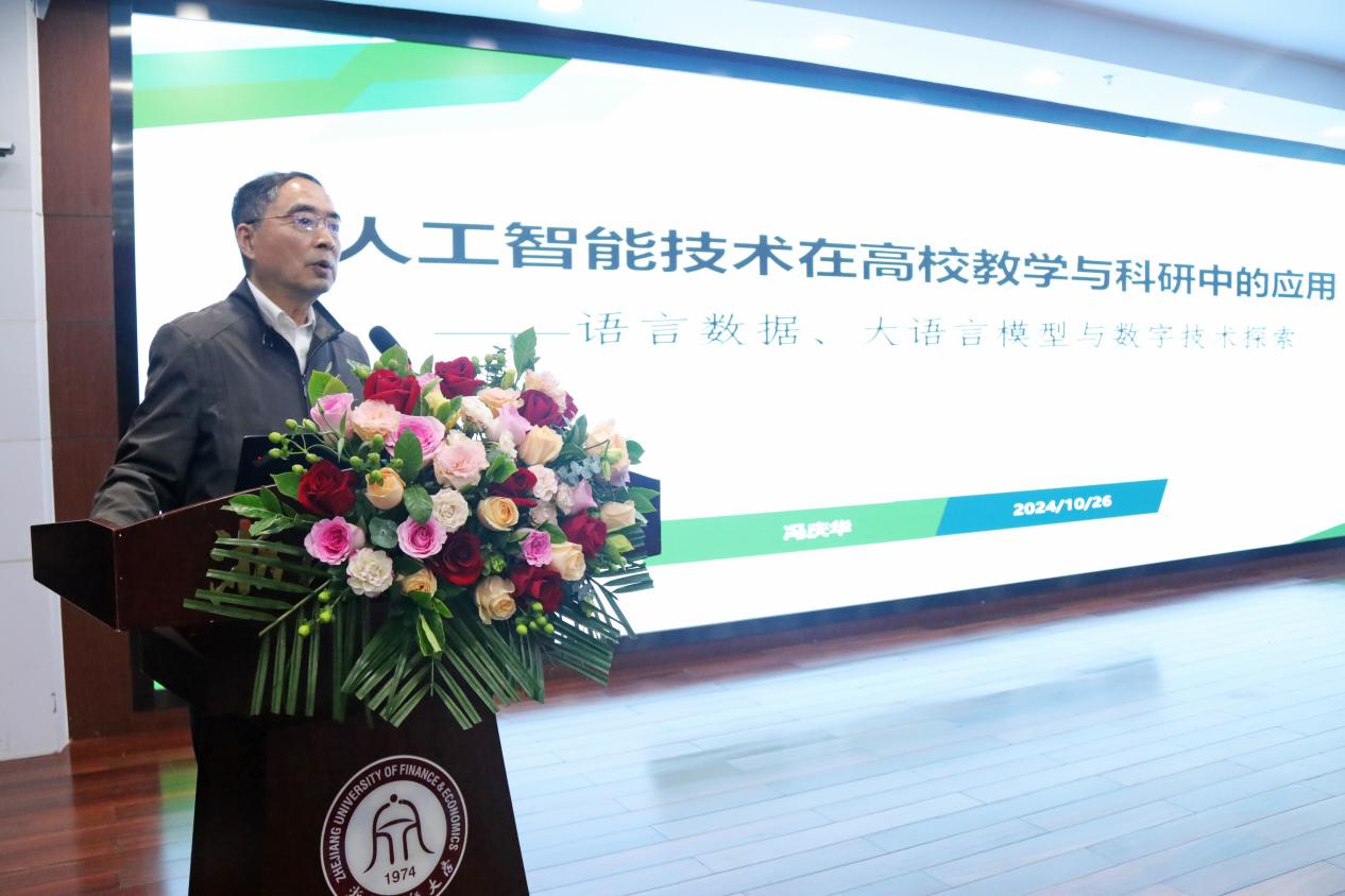 本网讯10月26日至27日,2024年全国高校数智经济方向“双师双能型”外语师资队伍建设研讨会在下沙校区举行。来自全国66所高校的180余名教师共聚一堂,聚焦“外语+数智经济”主题,探讨数智经济与外语教学的深度融合。上海外国语大学原副校长、教育部英语类专业教学指导分委员会副主任委员冯庆华,外语教学与研究出版社国际人才发展中心总经理冯涛,上海对外经贸大学国际商务外语学院副院长王玉,新疆农业大学外国语学院副院长王婷,浙江金融职业学院国际商学院副院长、全国关务职业教育教学指导委员会兼职副秘书长肖旭,中国国际电子商务中心特聘企业专家郑锴,杭州水梵猫文化创意策划有限公司总经理沈谊宇,瀚海Rroup CEO 于斌,外研社国际人才发展中心产教融合部教育服务经理牛琪雯等高校和企业专家出席会议。副校长李占荣出席开幕式并致辞。