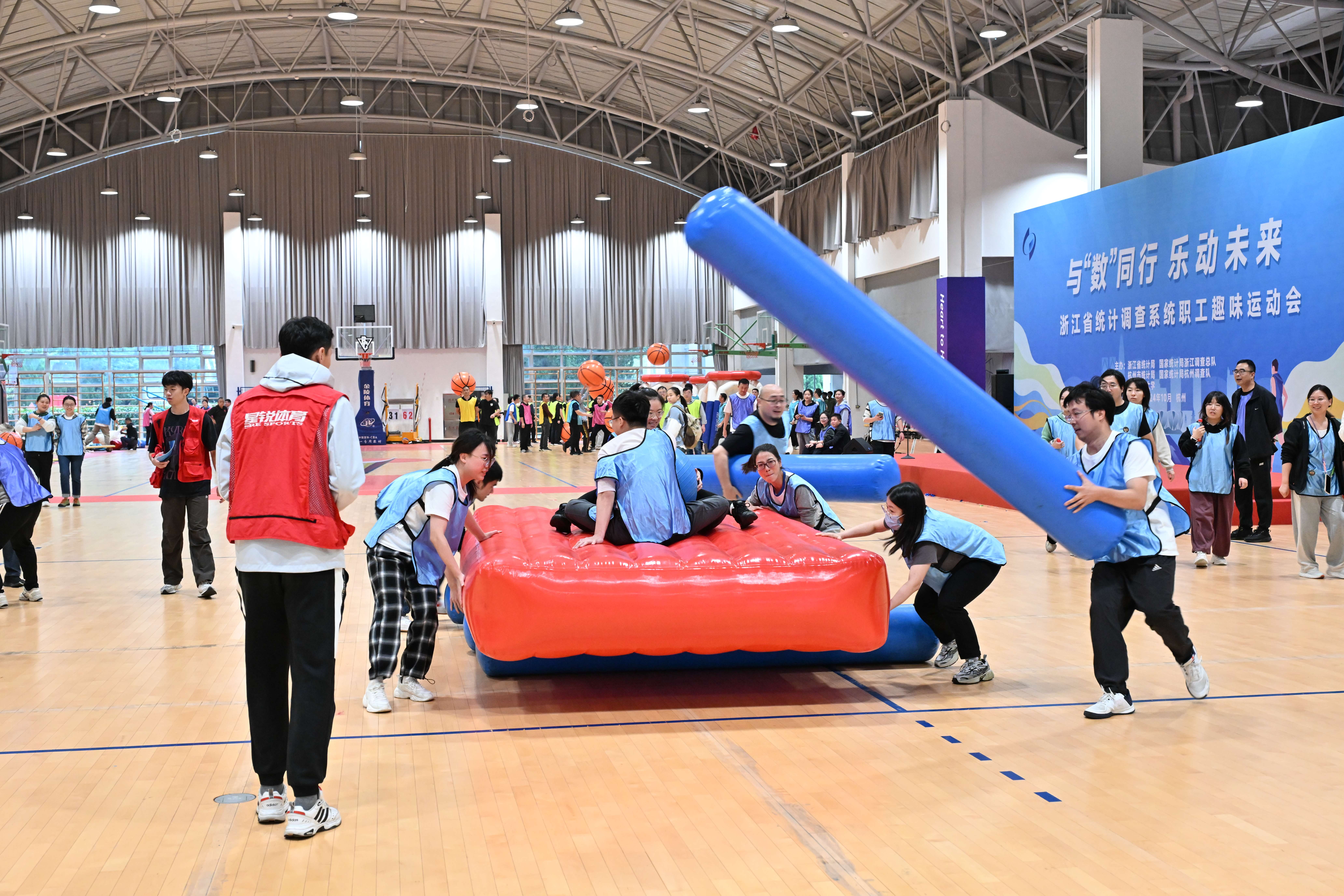 本次运动会是近年来全省统计调查系统规模最大,人数最多,组织形式最新颖的运动会。来自浙江省统计局、国家统计局浙江调查总队、杭州市统计局、国家统计局杭州调查队300余名职工参赛,组成8个联队开展“数海泛舟”“勇立潮头”“陆地冰壶”等8个集体项目和4个体验项目。学校数据科学学院组成数据探索队参加了拔河友谊赛项目。