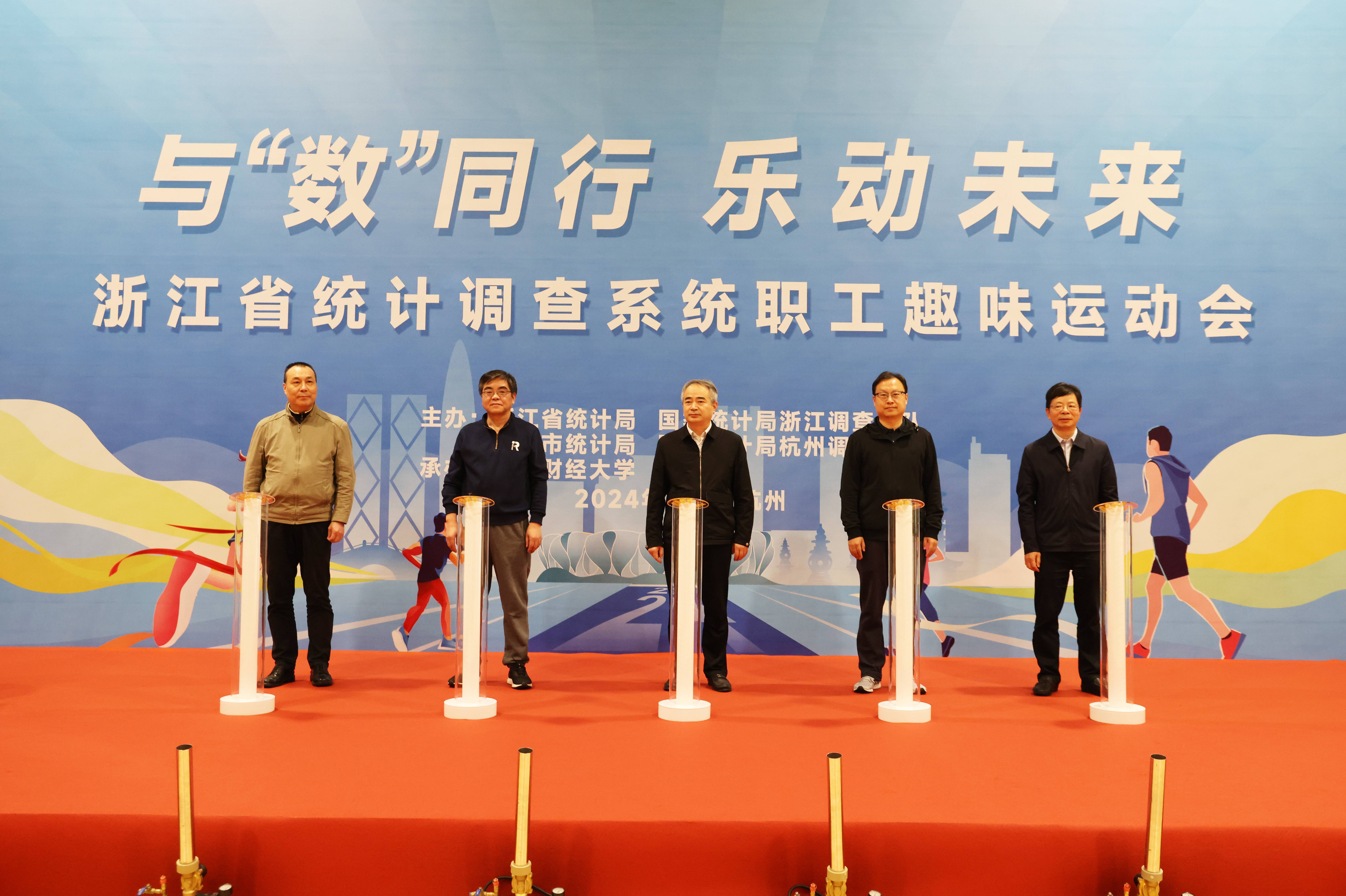 本网讯10月30日,“与‘数’同行,乐动未来”全省统计调查系统首届职工趣味运动会在学校东体育馆举行。浙江省统计局党组书记、局长吴胜丰,国家统计局浙江调查总队党组书记、总队长张斌,杭州市统计局党组书记、局长、调查队队长吴槐庆,国家统计局杭州调查队党组书记、队长殷柏尧、校党委书记李金昌参加开幕式。