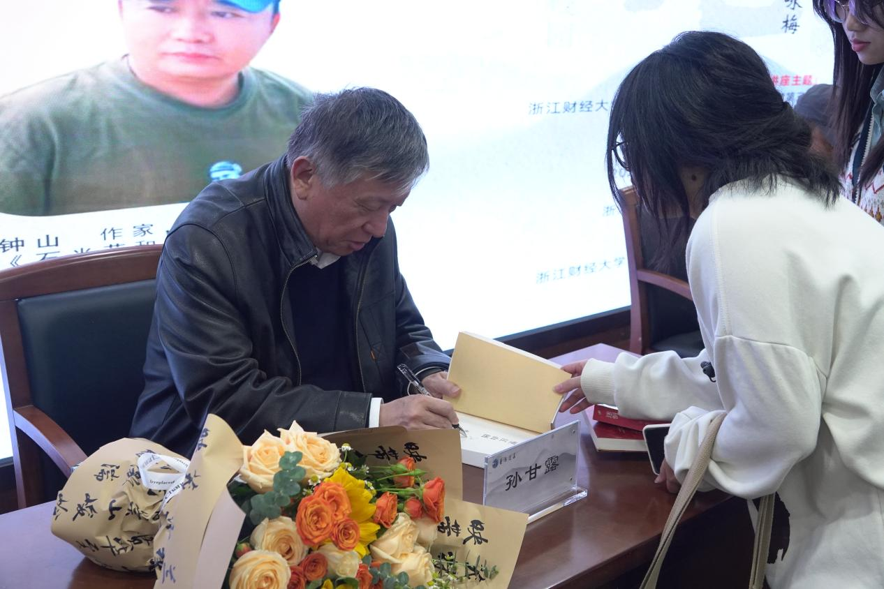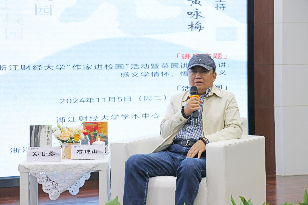 孙甘露、石钟山围绕“感文学情怀,悟人生要义”主题,为大家带来了一场充满智慧与温情的文学盛宴,与浙财师生分享了关于文学与人生的感悟。人文与传播学院教授黄咏梅主持对谈环节。本次活动由校党委宣传部副部长毛鸽主持。