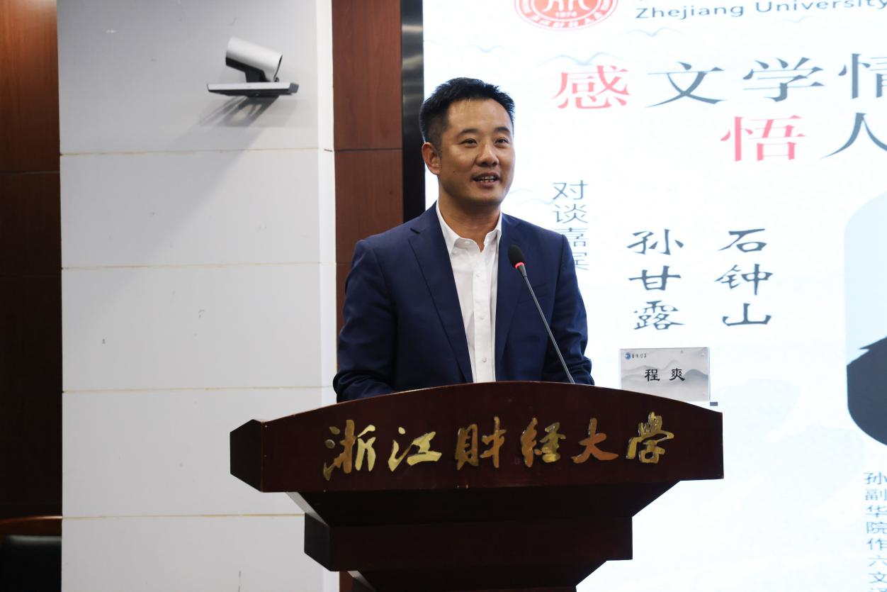 程爽在致辞中表示,高校是人才培养的重要基地,推进社会主义文化强国建设是高校义不容辞的使命。当前,学校正在大力实施“新财经战略”,致力于培养MAQ型“完全之人物”的“浙财金生”,“作家进校园”活动是拓宽学生文化视野、提高文学素养、满足青年学子对高品质文学需求的重要举措。他表示,经典的文学作品不受到时间的约束,会在一代代人心中绽放光彩。两位作家的文字充满着生命的力量,作品中体现的坚毅、勇敢、真诚等品格,正是当前数字经济高速发展的时代迫切需要的精神特质,希望通过此次活动,进一步丰富学校的人才培养模式,促进校园文化建设,以文培元,滋养心灵,为大家提供更加丰富的精神养分,促进学生全面发展。