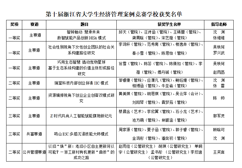 浙江省大学生经济管理案例竞赛是省级A类学科竞赛,由省教育厅、省经济和信息委员会主办,共分主赛道、共富赛道、公共管理赛道三个赛道,全省共有623支队伍(含研究生)参赛。大赛旨在促进我省高校经济管理类专业建设,提升案例研究与教学水平,增强大学生的实践创新能力和团结协作精神,发掘、提炼、传播当前经济转型和产业升级过程中的管理创新实践特色与亮点,为推广先进适用的管理理念、方法和模式提供案例借鉴。
