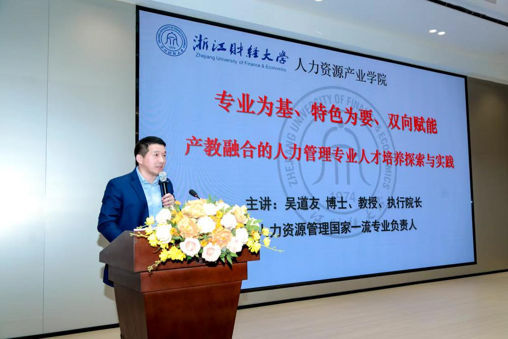董进才在致辞中对长期以来关心和支持学校发展的各位领导、老师、校友和社会各界朋友致以最诚挚的感谢!他介绍了学校人力资源管理专业和人力资源产业学院的发展历程,并提出了要在“新财经战略”指引下,继续推进教育与产业的深度融合,培养高素质人力资源管理专业人才。