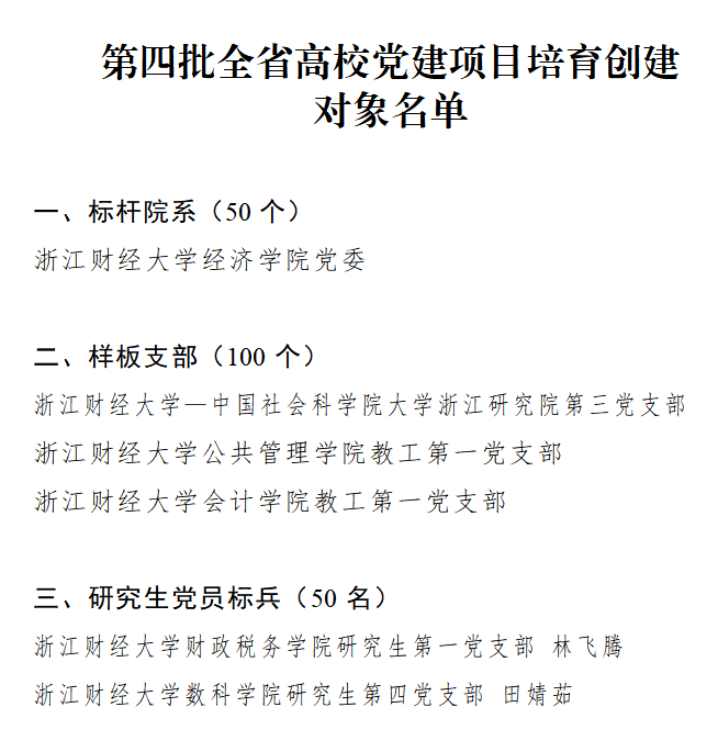 本网讯近日,省委教育工委公布了第四批全省高校党建项目培育创建单位名单。学校经济学院党委入选全省高校党建“标杆院系”;ued体育 -中国社会科学院大学浙江研究院第三党支部、公共管理学院教工第一党支部、会计学院教工第一党支部等3个支部入选全省高校党建“样板支部”;财政税务学院研究生第一党支部林飞腾、数科学院研究生第四党支部田婧茹等2名党员入选全省高校“研究生党员标兵”。