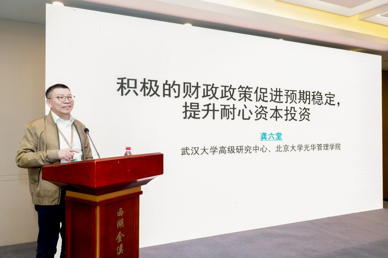 武汉大学高级研究中心主任、北京大学数量经济与数理金融教育部重点实验室主任、光华管理学院龚六堂教授发表了题为“积极的财政政策促进预期稳定,提升耐心资本投资”的主旨演讲。他回顾了近期财税体制和机制的研究进展,并指出中国经济一方面面临外部压力、就业压力持续增加,投资放缓,企业盈利能力下降等多重挑战,另一方面也出现了内需恢复、收入保持增长的积极信号。龚教授利用内生的贴现因子模型阐释了耐心资本积累促进长期经济增长的影响机制。基于政府公共支出影响贴现因子的模型,他还进一步建议,应使用积极的财政政策来改善社会预期。他认为,发展中国家的资本回报份额还比较高,所以政府不仅应考虑生产性支出,还更应重视教育、医疗、社会保障等公共支出,从而为提升社会信心提供更强助力。