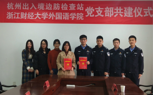 本网讯12月19日,外国语学院学生党支部与杭州出入境边防检查站执勤业务一科党支部举行结对共建仪式。杭州出入境边防检查站执勤业务一科党支部书记马義超、外国语学院党委副书记林凡等出席共建仪式。