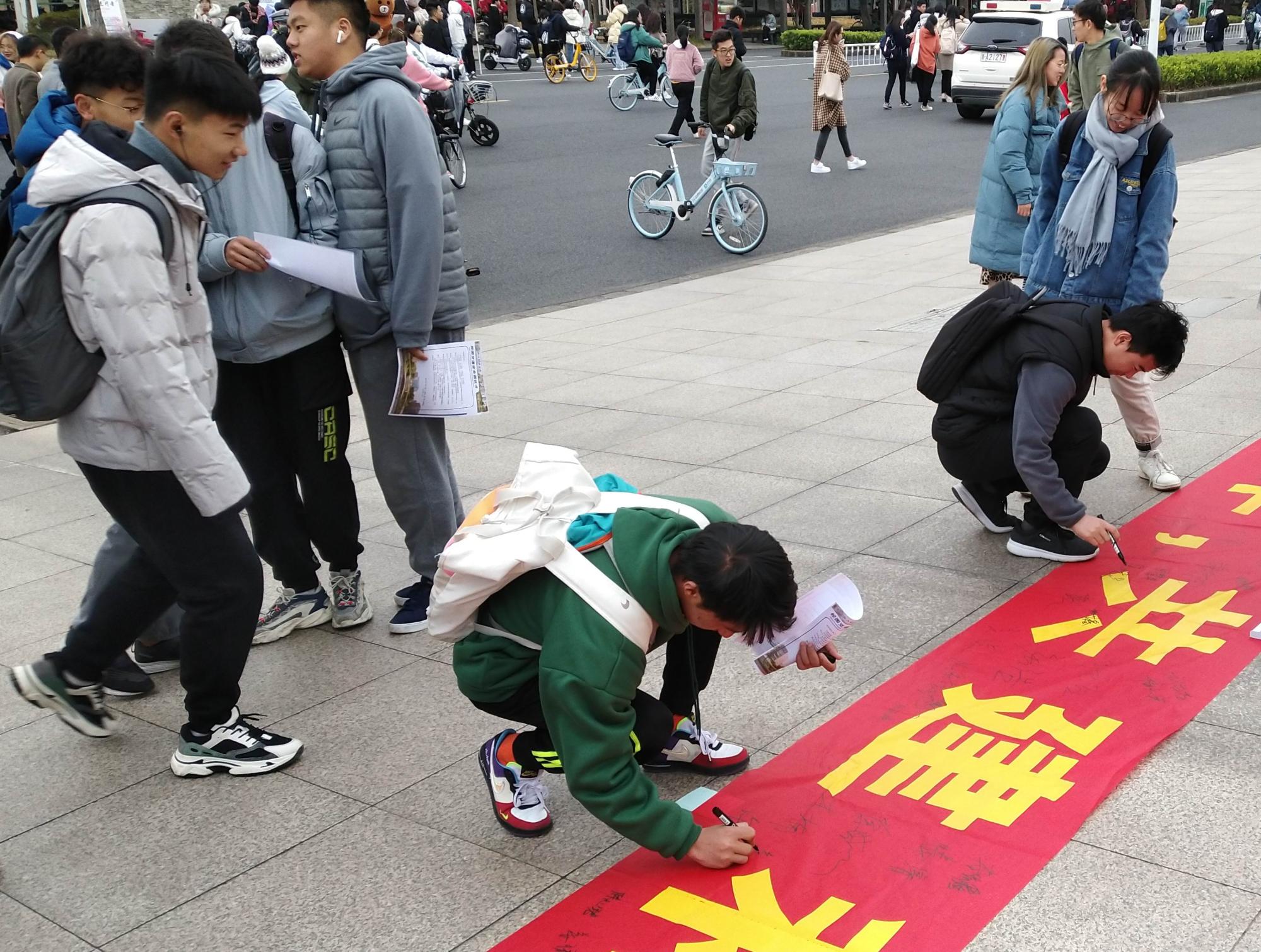 活动中,工作人员向来往师生发放《校园交通安全倡议书》和交通法规等宣传资料,引导师生参观学习警示教育宣传展板。在“安全骑行 规范停车 共建和谐交通”签名活动现场,同学们积极踊跃地参与横幅签名活动,承诺将遵守交通法律法规,牢记出行安全相关知识,争做文明浙财人。