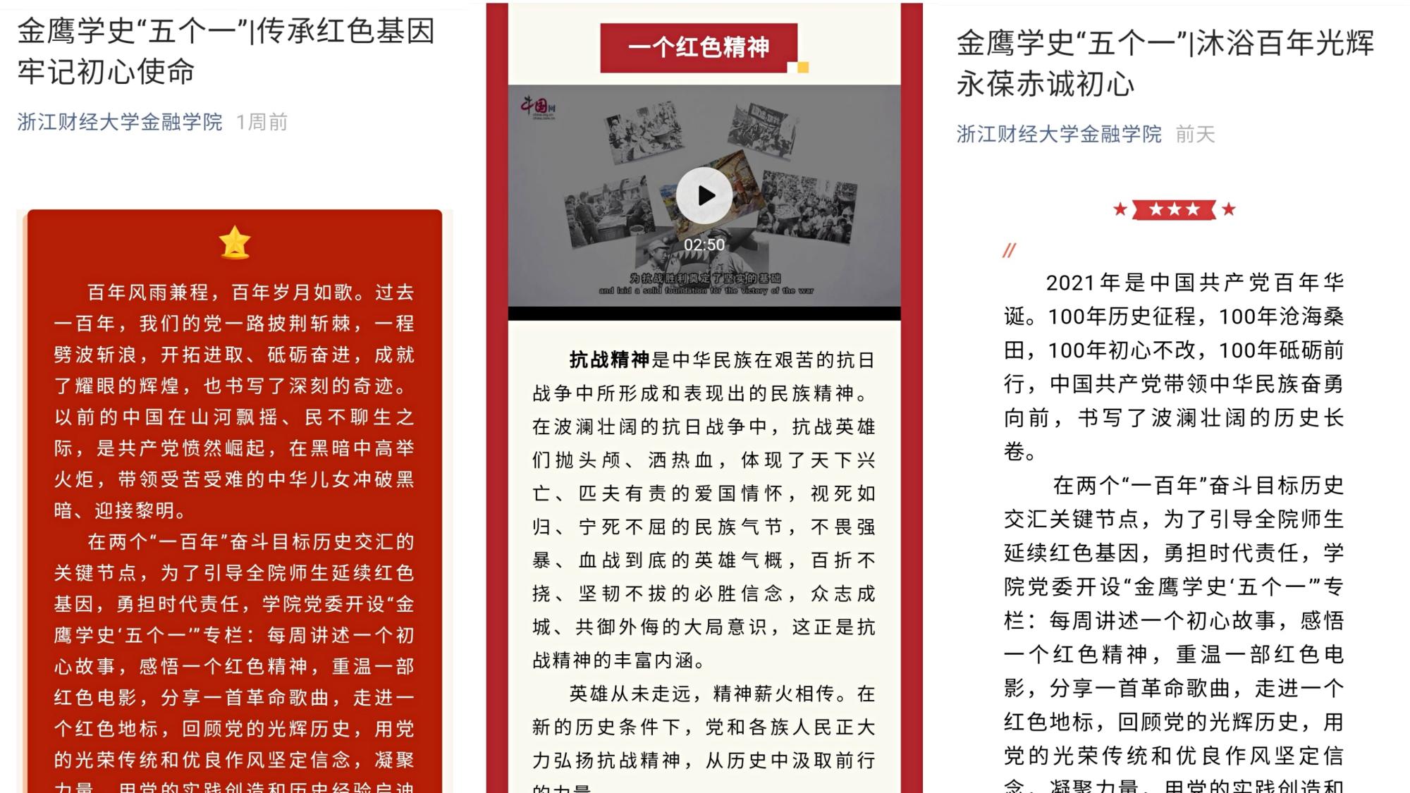 学院官微开设“金鹰学史‘五个一’”专栏:每周讲述一个初心故事,感悟一个红色精神,重温一部红色电影,分享一首革命歌曲,走进一个红色地标。引导广大师生深入学习党的光辉历史故事,加深对党的感情认同、理论认同、政治认同,形成扎根于心的自信和信仰。