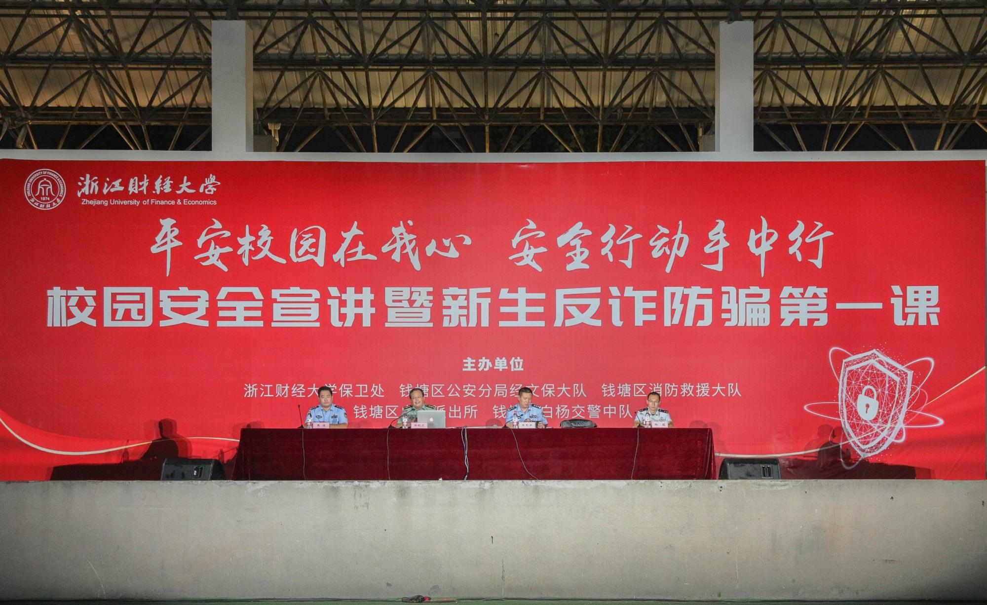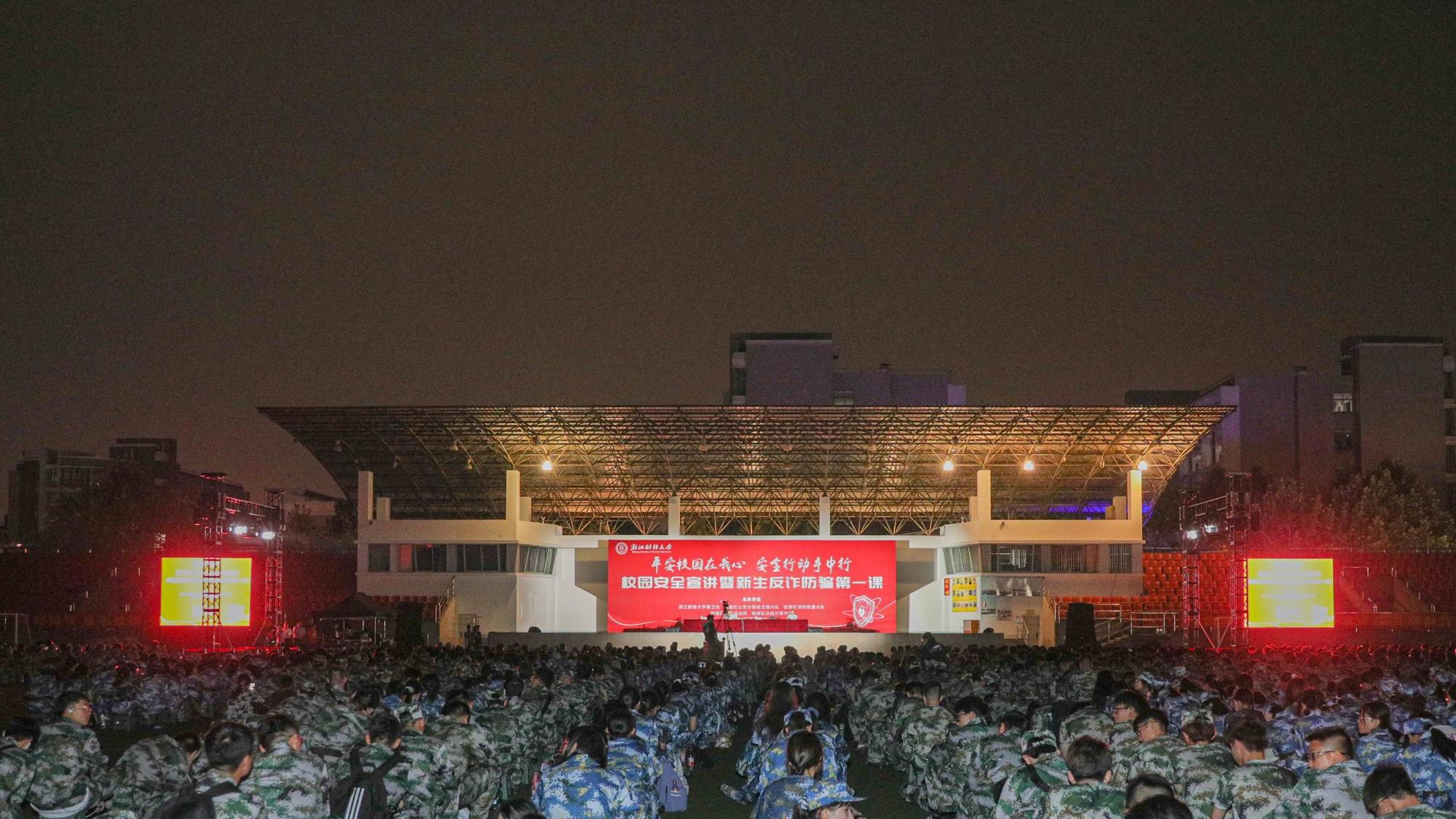 本网讯9月7日,学校联合杭州市公安局钱塘区分局经文保大队、消防救援大队、白杨派出所、白杨交警中队开展了校园安全宣讲暨新生反诈防骗第一课活动。4000余名新生参加活动。