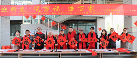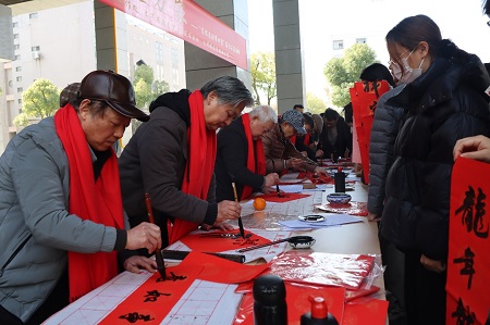 活动当天,闻讯而来的园区企业和周边社区居民络绎不绝,现场热火朝天、气氛热烈。参加新年送春联公益活动的10余名退休教职工平均年龄67岁,最大年龄75岁。老同志们泼墨挥毫,把新春祝福浓缩在一副副春联中,二个小时为群众送“福”字和春联500余件。