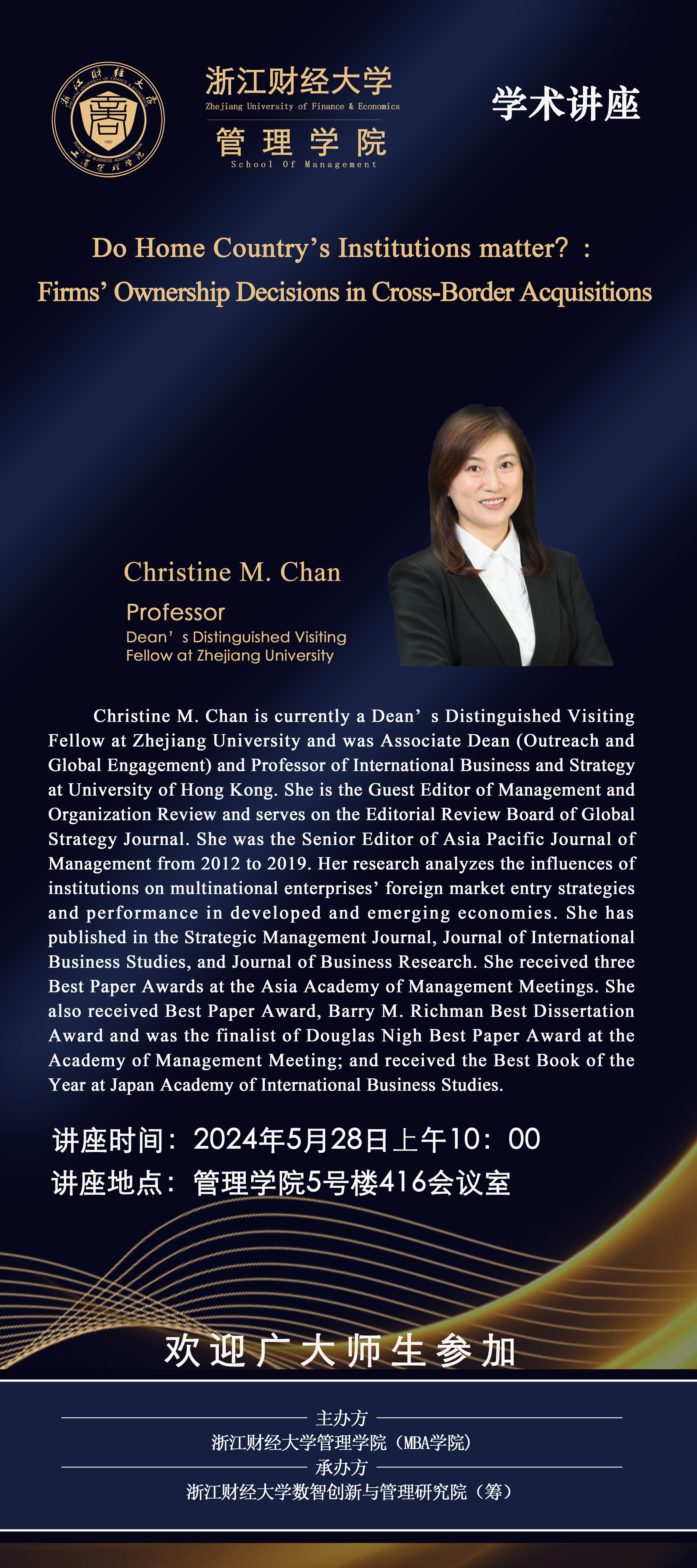 【管理学院公开讲座】Christine M. Chan教授:Do Home Country’s Institutions matter?: Firms’ Ownership Decisions in Cross-Border Acquisitions