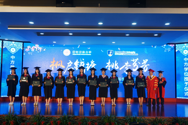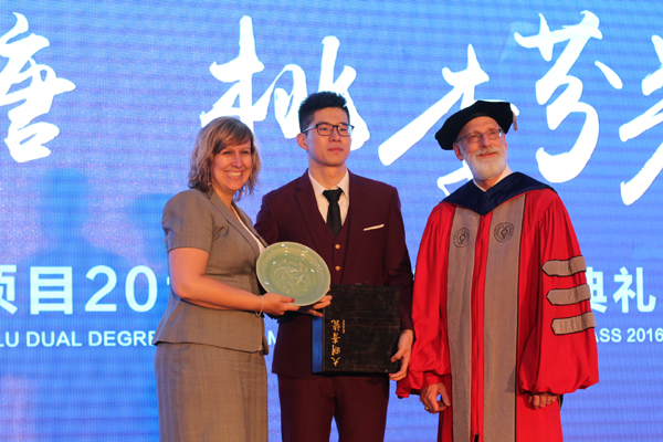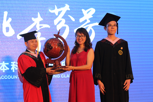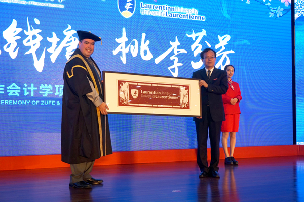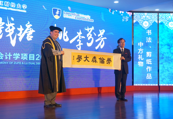 副校长黄建新为25名获得双学位的毕业生颁发了奖学金。劳伦森大学校长Dominic Giroux先生、管理学院院长Stephen Havlovic先生为毕业生颁发了劳伦森大学工商管理学士学位证书。钟晓敏校长、会计学院李连华院长为毕业生授予中方学位证书,并为毕业生拨穂。