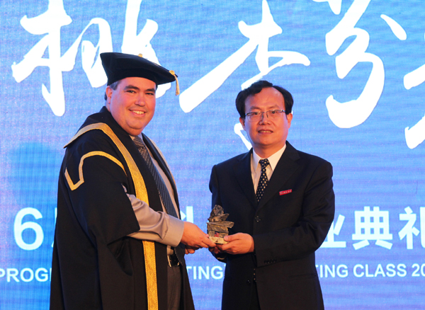 校长钟晓敏在致辞中向远道而来的客人致以敬意,对劳伦森大学多次率团访问以及加拿大注册会师协会、加拿大TPEI教育集团在中加双方合作办学中的无私奉献表示感谢,并向同学们表达了毕业祝贺之情。他对同学们提出了四点殷切希望:一是“坚守梦想”,无论在坚持梦想的途中遇到何种挫折,都要让梦想照亮同学们前进的道路;二是“肩负责任”,无论驰骋九州还是远跨重洋,希望同学们牢记自己肩负着国家和社会进步的伟大使命;三是“懂得成功”,成功是尽力把每次小事都做好,小的成功会积累成大的飞跃;四是“维护兴趣”,希望同学们能够接受文体艺术所带来的心灵交流,提升自己生命厚度。