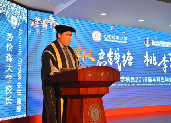 加拿大劳伦森大学Dominic校长在讲话中对首届中加学子圆满完成学业表示祝贺。他强调,正是两校共同竭力为学生创设良好的环境,才使得学生的见识和才能将来能够在国际社会中卓有成就,希望能进一步加深中加两校交流合作。