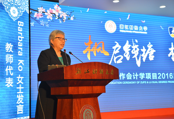 加拿大注册会计师协会中国区执行理事Babara Ko女士作为教师代表发言,她回顾了合作交流的艰辛创建过程,指出优良的培训项目与教程、具备学习能力和刻苦的优秀学生、两校优秀的师资队伍与教学支持是中加项目成功的三大关键因素。家长代表马玉明和学生代表祝瑜也先后上台发言表达对中加项目的祝愿和期许。