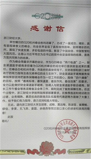 近日,G20杭州峰会财金渠道副手磋商指挥部给我校致感谢信,对我校学校圆满完成财金副手磋商会议服务工作表示感谢。