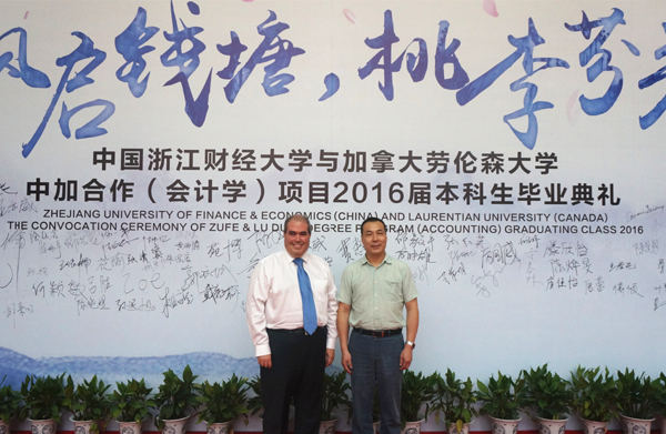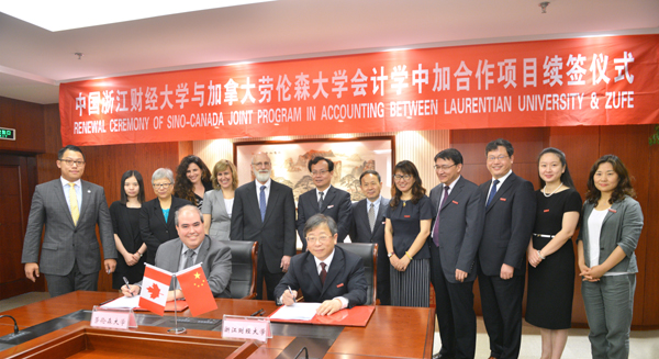 6月11日上午,中加合作会计学办学项目续签仪式在行政楼412会议室举行。校长钟晓敏与加拿大劳伦森大学校长多米尼克·吉鲁共同签署了协议书。