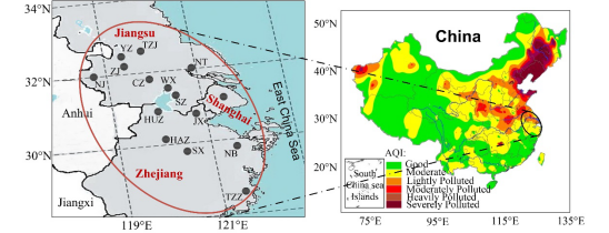 长三角区域冬春季易爆发严重雾霾污染,夏秋季常爆发严重的臭氧污染,是我国推行重点区域联防联控的区域之一。本研究以长三角区域15个城市为研究单元,包括上海(SH)、浙江省的杭州(HAZ)、湖州(HUZ)、嘉兴(JX)、绍兴(SX)、宁波(NB)、台州(TZZ)和江苏省的南京(NJ)、苏州(SZ)、无锡(WX)、常州(CZ)、扬州(YZ)、镇江(ZJ)、泰州(TZJ)、南通(NT),他们都有着密集的人口、发达的经济、交通、建筑业等,如图1所示。