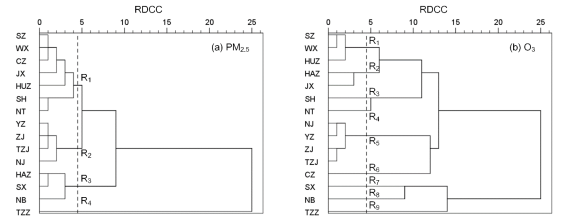 图2(a)是对PM2.5联动候选城市的聚类树状图,15市被分成4组,每一组内城市间的污染相关性特征最相似,即每一组就是长三角区域的一个联动子区域。由此,长三角可划分为4个PM2.5联动子区域,分别为R1={苏州、无锡、常州、嘉兴、湖州、上海、南通}、R2={扬州、镇江、泰州、南京}、R3={杭州、绍兴、宁波}、R4={台州}。同理,长三角区域的15个O3联动候选城市可划分为9个O3联控子区域,分别为R1={苏州、无锡、湖州}、R2={杭州、嘉兴}、R3={上海}、R4={南通}、R5={南京、扬州、镇江、泰州}、R6={常州}、R7={绍兴}、R8={宁波}、R9={台州},如图2(b)所示。长三角区域的4个PM2.5联控子区域和9个O3联控子区域的地理分布示意图如图3所示。从联防联控范围划分结果易知,臭氧具有小范围局地污染特征,因此更适合在小范围内开展联防联控。