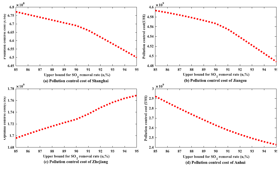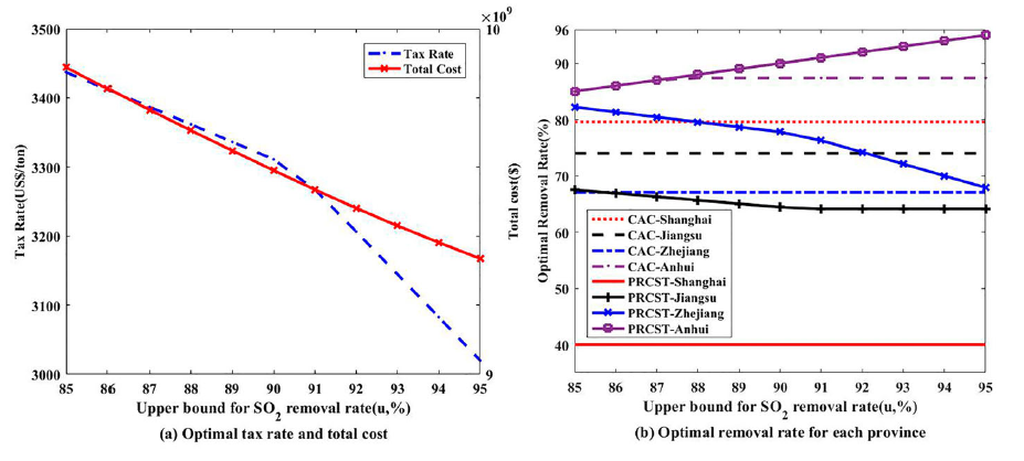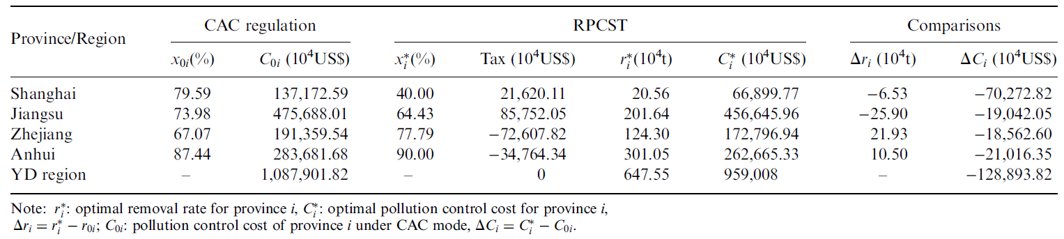 在以上参数赋值基础上,采用松弛法和KKT条件法对模型进行求解,Matlab R2017b求解的结果如表3所示。结果表明,在税收调控模式(Regional pollution control scheme with tax, RPCST)下,长三角区域2015年工业SO2的最优税率为3310.89美元/吨。在RPCST下,上海和江苏的污染最优去除率均比与行政命令管制模式(Command and control, CAC)下降,但浙江和安徽的最优去除率比CAC上升。上海和江苏将分别转移6.53万吨和25.9万吨的污染物给浙江和安徽,相应地,浙江和安徽分别多承担21.93万吨和10.5万吨的污染去除任务。为此,上海和江苏须分别向生态环境部缴纳21620.11万美元和85752.05万美元的税金,生态环境部想浙江和安徽分别给予72607.82万美元和34764.34万美元,作为其超额完成减排指标的奖励。与CAC相比,RPCST下沪苏浙皖减排成本分别降低了70272.82、19042.05、18562.6和21016.35万美元,整个区域减排成本比CAC降低11.85%,128893.82万美元。由此可见,RPCST的防控效果明显优于CAC模式。