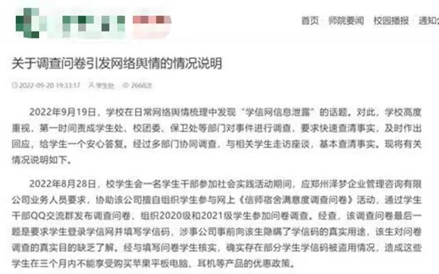 9月20日,某高校发布了一篇《关于调查问卷引发网络舆情的情况说明》,对一起涉嫌侵犯学生隐私与个人信息安全的事件作出了详细通报。