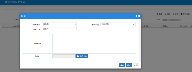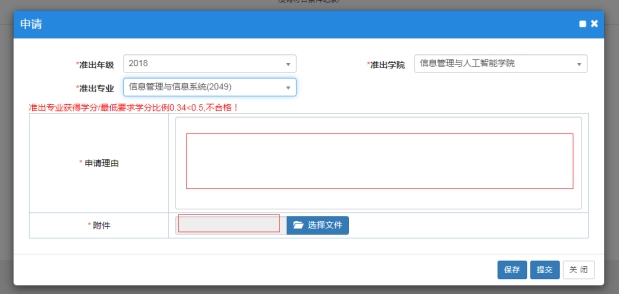 3.主修准出专业申报条件:主修准出其他专业须满足修读完成课程学分比例达到准出专业的50%,若未达到准出专业的50%,通过课程替代可达50%者,需提交申请理由和替代说明附件,再提交申请。