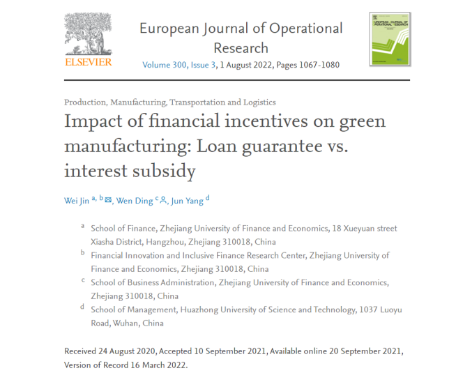 近日,金融学院副教授金伟与合作者丁雯博士(工商管理学院)、杨珺教授(华中科技大学)的论文“Impact of financial incentives on green manufacturing: Loan guarantee vs. interest subsidy”在国际权威期刊《European Journal of Operational Research》第300卷(2022年)第3期正式发表。该期刊被SCI一区检索,为ABS4星级、FMS A类期刊。论文链接:https://doi.org/10.1016/j.ejor.2021.09.011