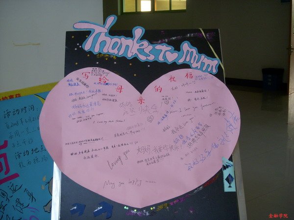 本次活动从五月初已经开始进行。由我院学生会宣传部负责编制的名为“写给母亲的祝福”的海报,将同学们的祝福以海报的形式展出,给同学们一个平台向母亲表达自己的祝福,收到了不错的效果。