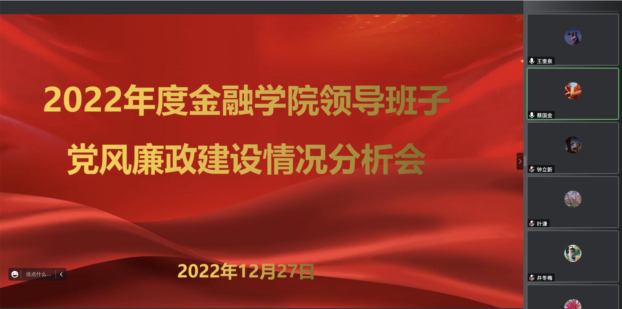 12月27日下午,金融学院2022年度领导班子党风廉政建设情况分析会在线上举行。校党委委员、副校长王奎泉,学院党政领导班子成员,学院党委委员、纪委委员,系主任、部门主要负责人代表等出席会议。会议由学院党委书记蔡国金主持。