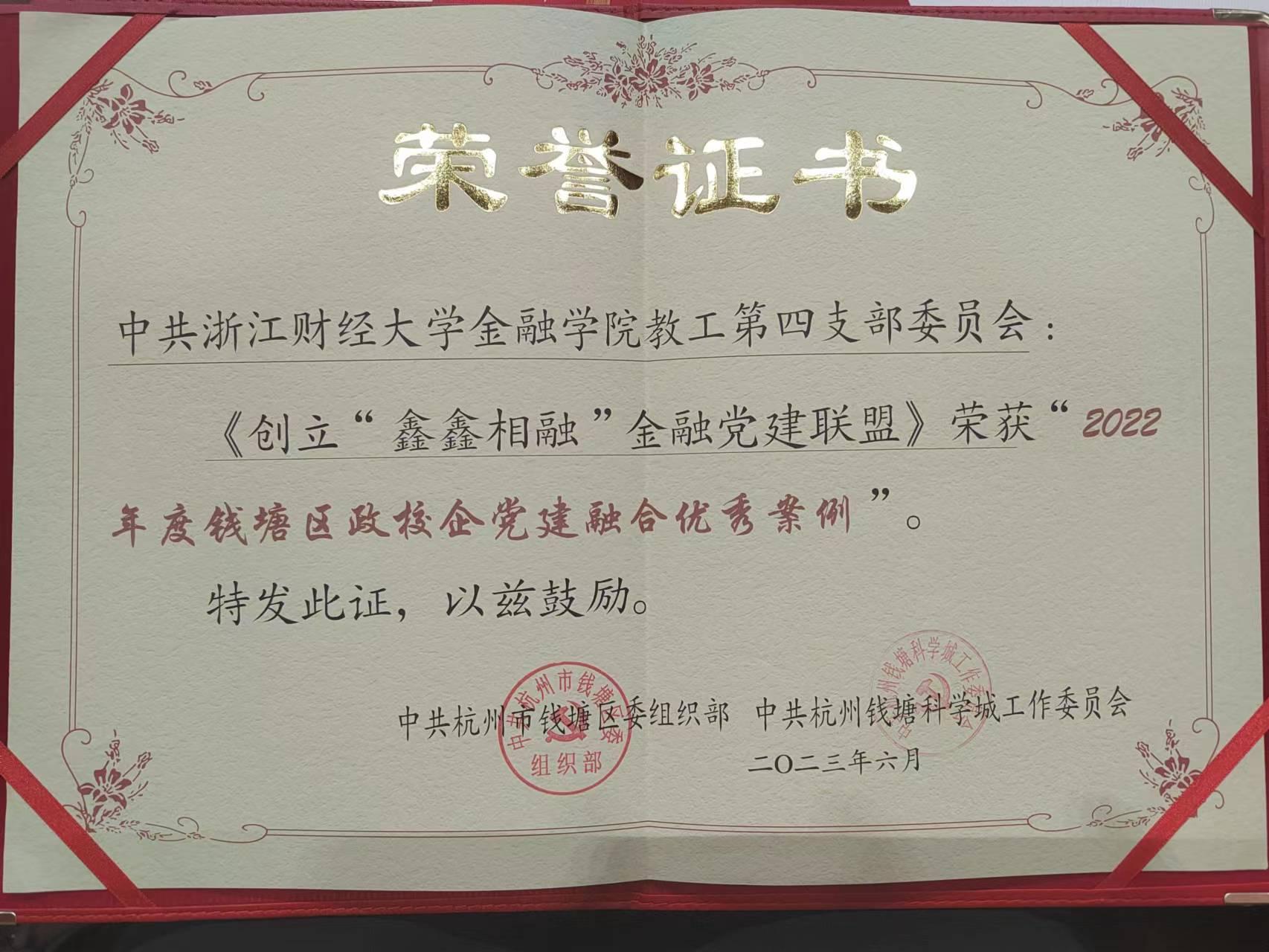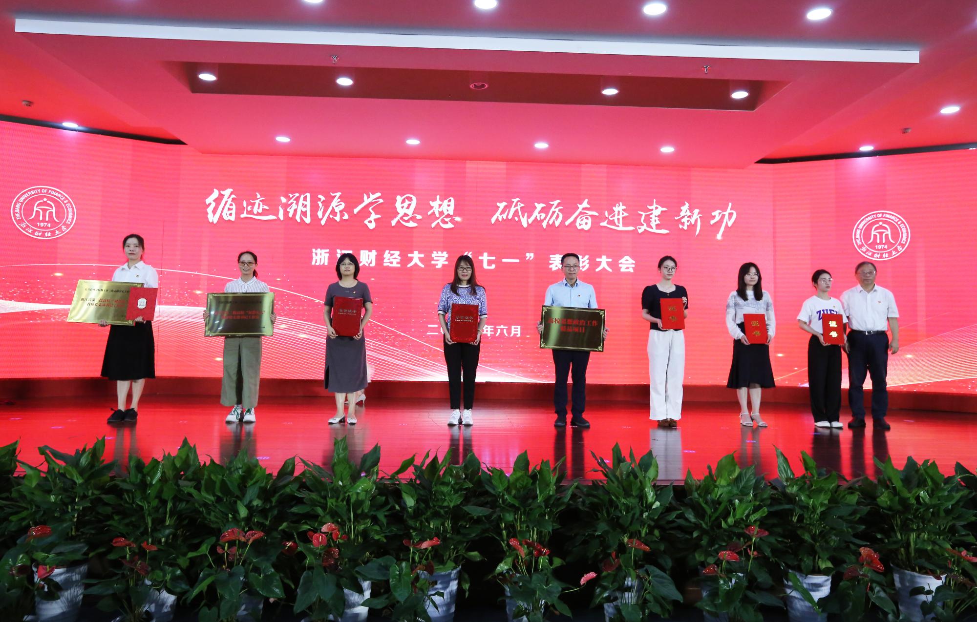 6月29日上午,我院教工第四党支部书记徐峰受邀参加钱塘区“迎亚运 庆七一 促融合 建新功”庆祝中国共产党成立102周年活动,支部的《创立“鑫鑫相融”金融党建联盟》荣获钱塘区政校企党建融合优秀案例。29日下午,在校“循迹溯源学思想 砥砺奋进建新功”“七一”表彰大会上,我院获党建工作表彰5项。其中,党员教师王伟伟、谢敏获第六届全国高校网络教育工作案例二等奖;教工第一党支部获校“先进基层党组织”;教工第四党支部获校“支部建设优秀奖”;教工第一党支部书记金骋路获校“优秀党务工作者”;教工第三党支部书记叶谦工作室获校第四批“双带头人”教师党支部书记示范工作室。这些荣誉的获得既是对我院党建工作的认可,也是学院党委对建党102周年的隆重献礼。