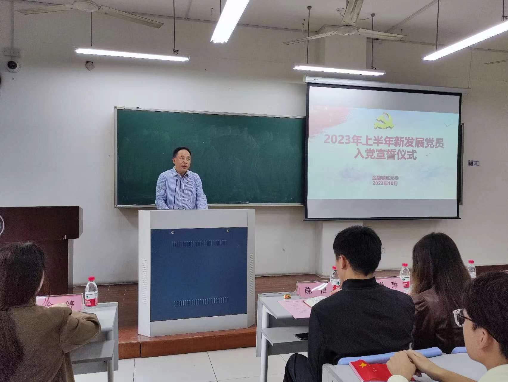 10月10日下午,金融学院党委在学院楼104教室举行2023年上半年新发展党员入党宣誓仪式。学院党委书记蔡国金、党委副书记谢敏、各学生党支部书记、党建指导老师、各支部支委、老党员代表及全体新发展党员出席了本次仪式。仪式由专职组织员翟丽媛主持。