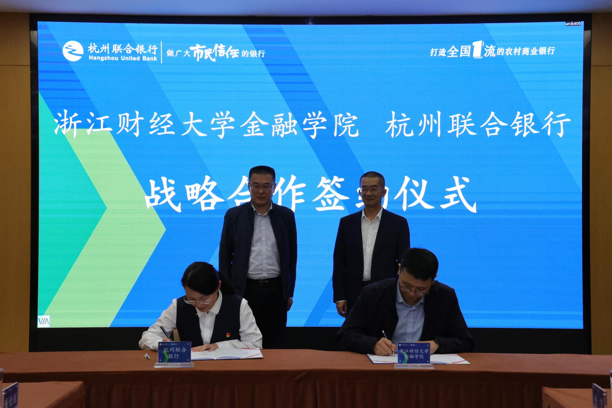 10月11日,金融学院与杭州联合银行于杭州联合银行总部大楼举行战略合作签约仪式。金融学院与杭州联合银行在学生校外实践等领域进行过长期合作,并获得省级产学合作协同育人项目立项。校党委副书记徐晓东,金融学院院长王聪聪、教工第一党支部书记金骋路,杭州联合银行董事长张海林、行长闻毅、人力资源部总经理周凌霞、两办党支部书记韩琮琪,蓝山投资有限公司董事长王晓明、董事张引生等出席仪式。