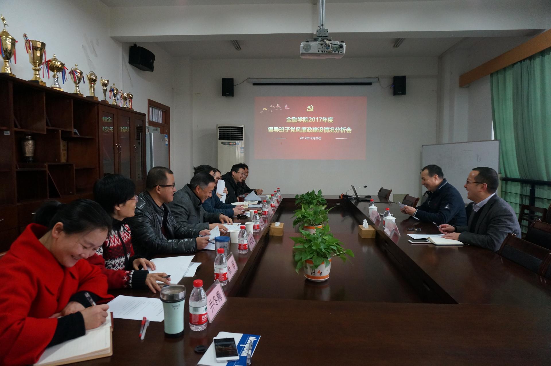 12月26日上午,金融学院2017年度领导班子党风廉政建设情况分析会在学院楼422会议室举行。校党委书记李金昌,校党委办公室、校长办公室副主任朱旭明,学院党政领导班子全体成员,学院党委委员,学院纪委委员参加了本次会议。会议由院党委书记蔡国金主持。