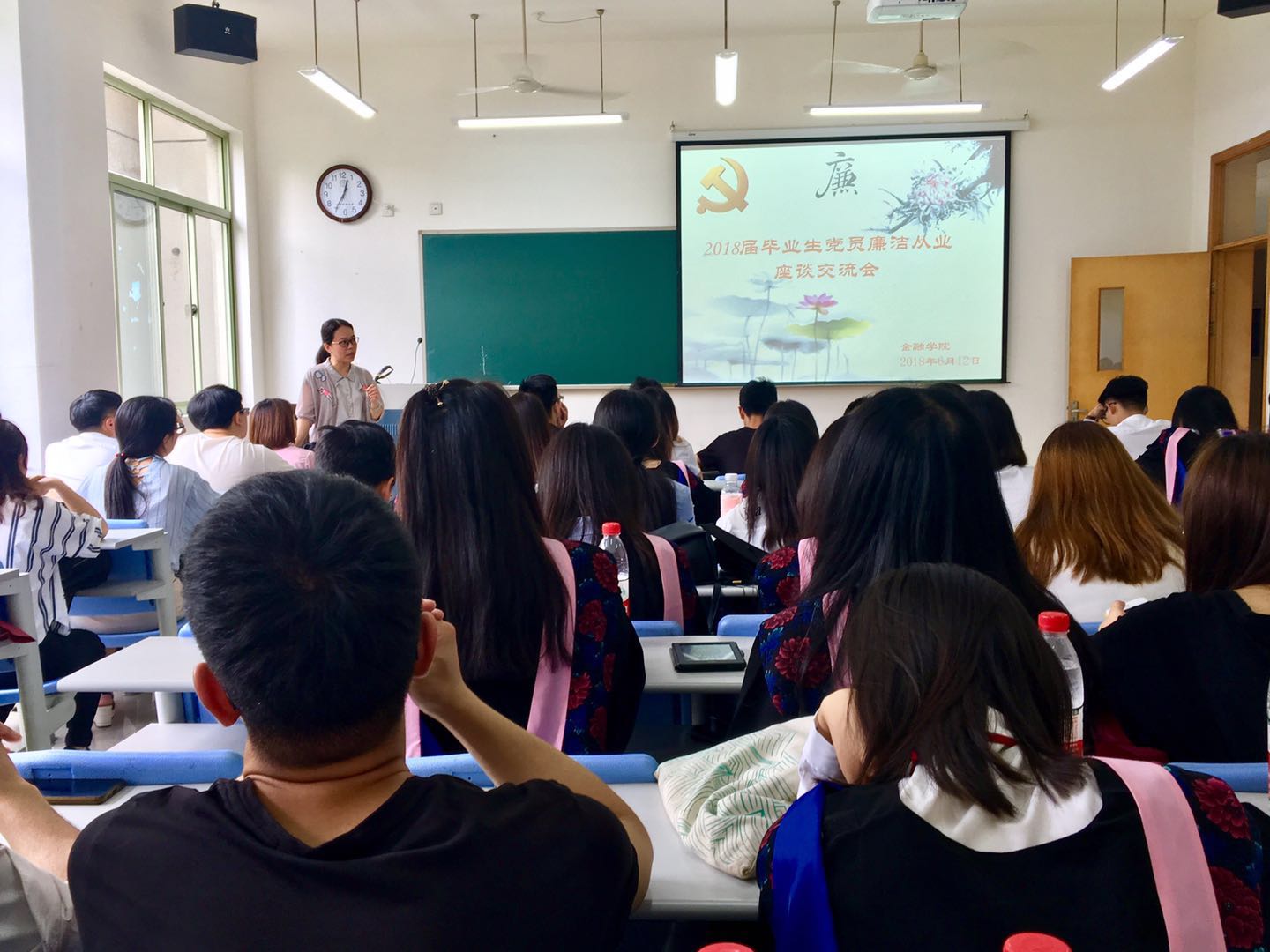 6月11日中午12:30,金融学院在3号楼101教室召开2018届毕业生党员廉洁从业教育座谈会。学院党委副书记叶秀出席会议,辅导员聂亚平及全体毕业生党员参加会议。