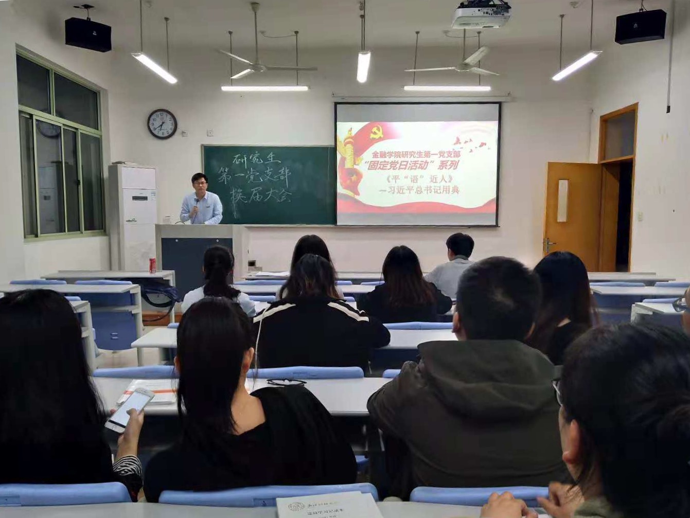 10月25号晚上7点10分,ued体育 金融学院研究生第一党支部全体党员在金融学院101教室参加了《平“语”近人——习近平总书记用典》系列节目专题学习主题党日活动,活动由支部书记张伟恩主持。