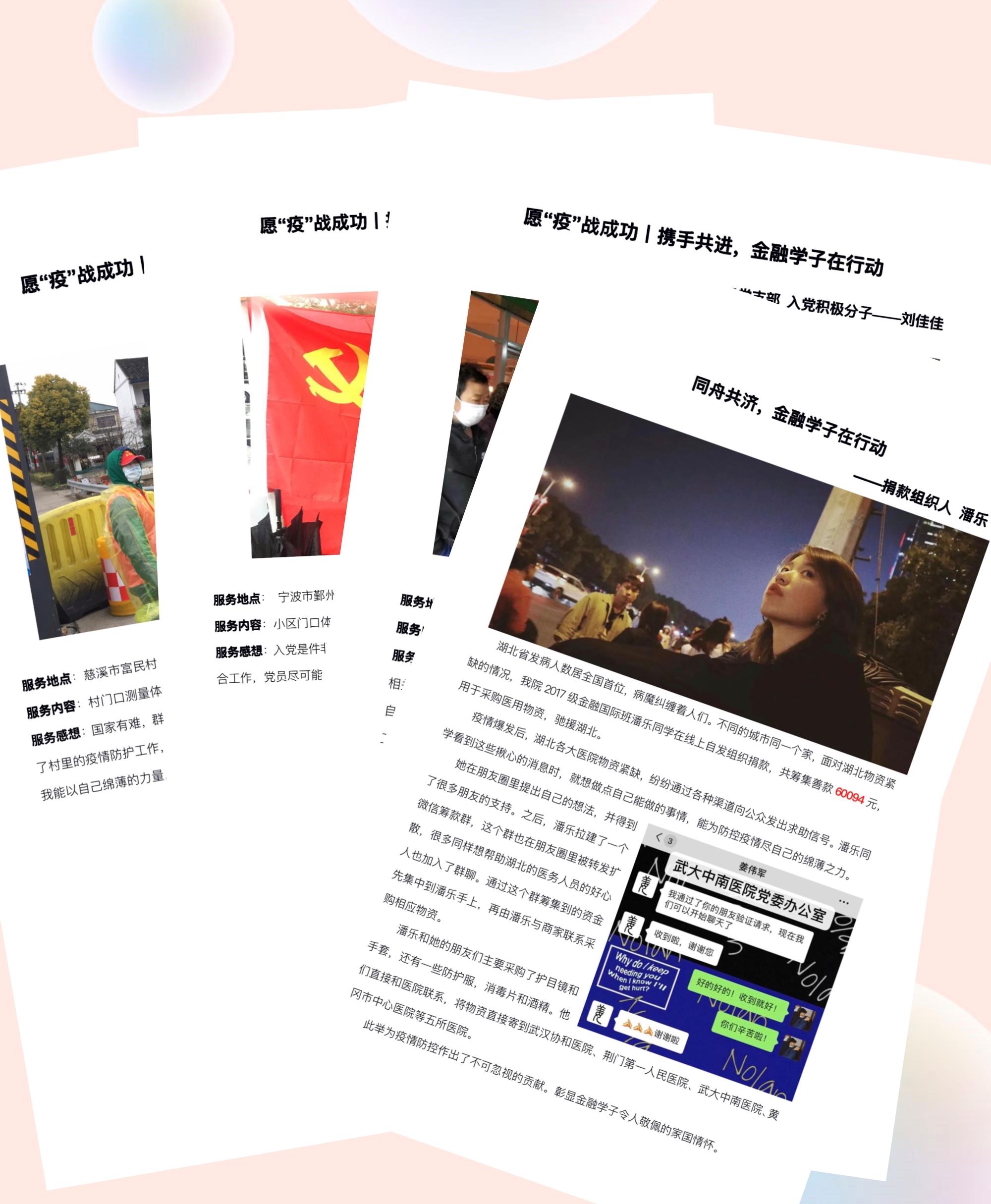 五、致敬榜样力量,宣传在疫情防控工作中涌现的先进典型和感人事迹。学院2017级金融国际班潘乐同学在线上自发组织捐款,共筹集善款6万余元,采购护目镜、手套、防护服等急缺医疗物资,寄往武汉协和医院、荆门第一人民医院、武大中南医院、黄冈市中心医院。本科生第二党支部党员阮佳伊、本科生第四党支部党员朱昊磊、研究生第四支部党员单瑶佳投身抗疫志愿服务工作,在所辖地社区主动扛起疫情防控责任。本科生第二党支部入党积极分子刘佳佳在党员父亲的带领下,向当地社区捐赠了口罩、测温仪等物品,协助政府部