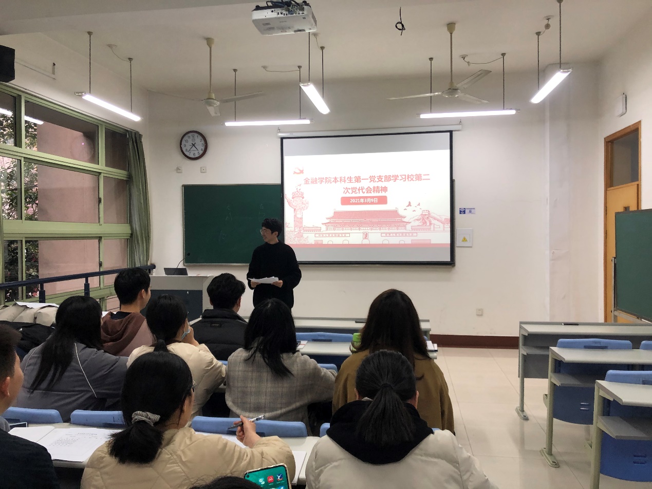 3月9日,金融学院本科生第一党支部召开党员大会,深入学习贯彻落实校第二次党代会精神。支部全体党员参加会议。