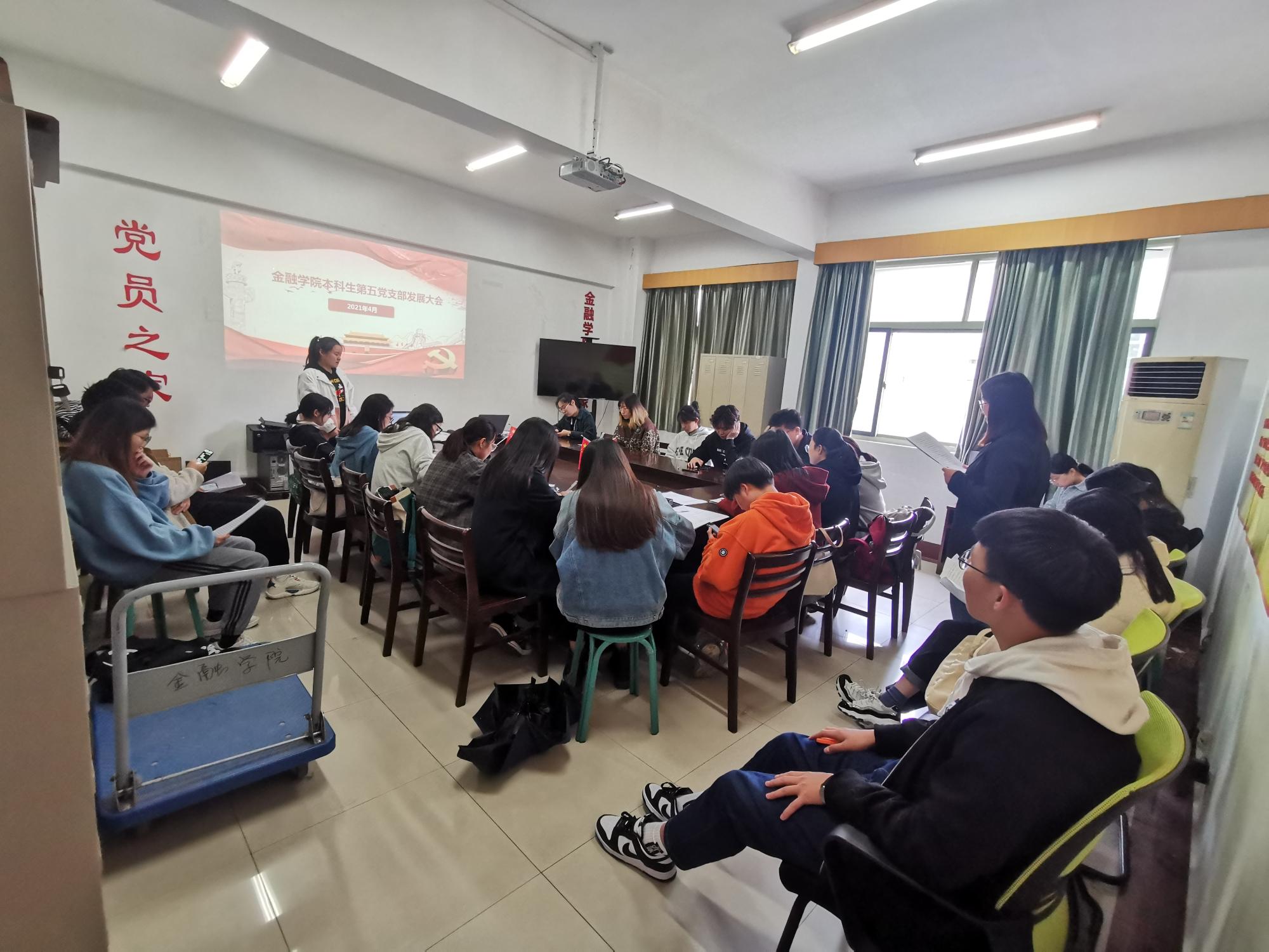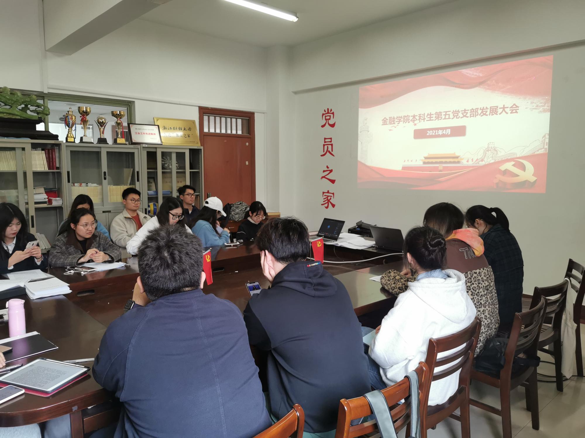 金融学院本科生第五党支部于2021年4月14日召开了支部党员发展大会暨四月“党员青年 犇向百年”主题党日活动动员会。大会主要议程包括:讨论接收李格等10名同学为预备党员,介绍动员本支部四月“党员青年,助跑党建百年”主题党日活动。支部全体正式党员、预备党员、本次发展对象参加了此次大会。本次大会由本科生第五党支部书记沈晓云同志和支部党员丁洁婷同志主持。