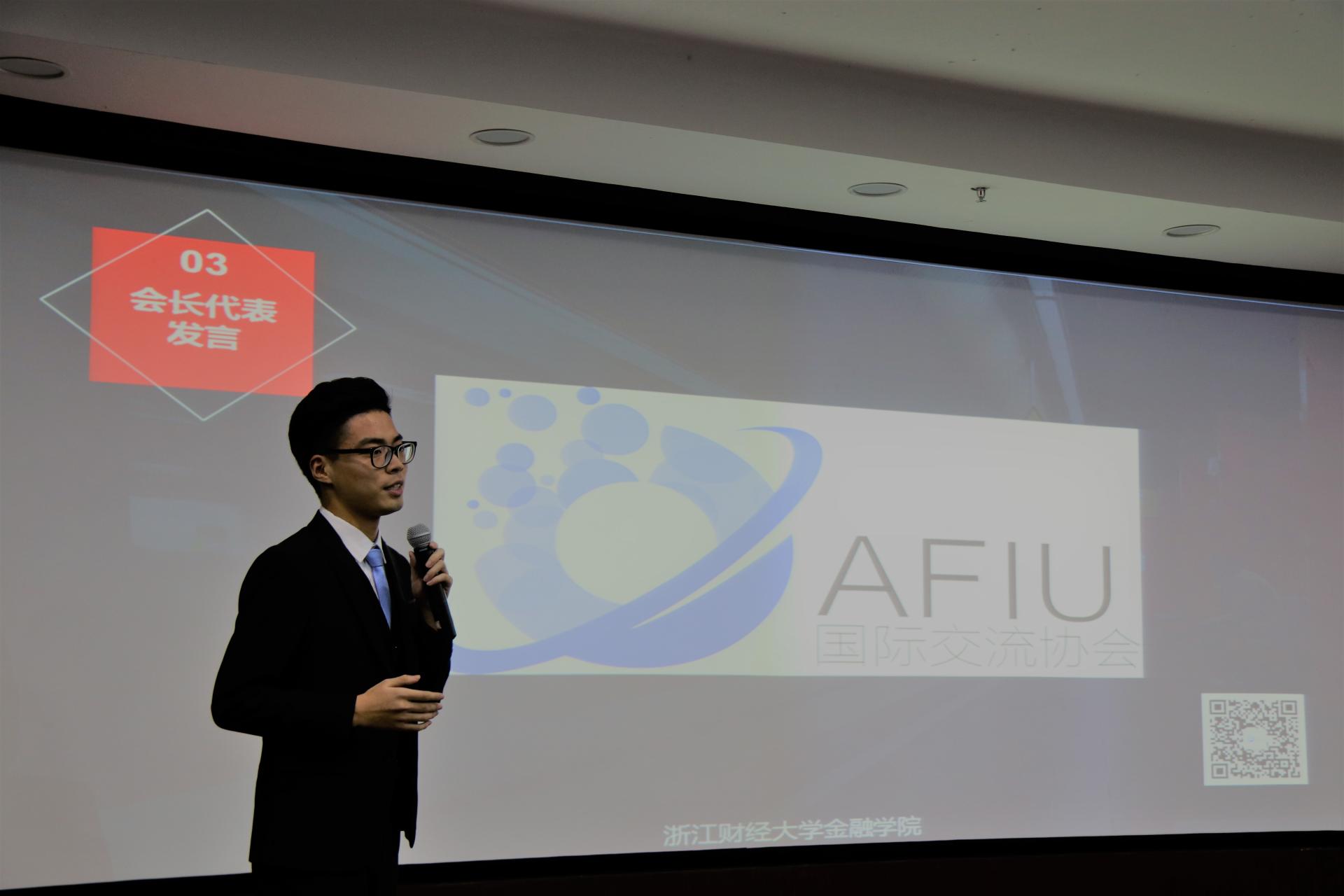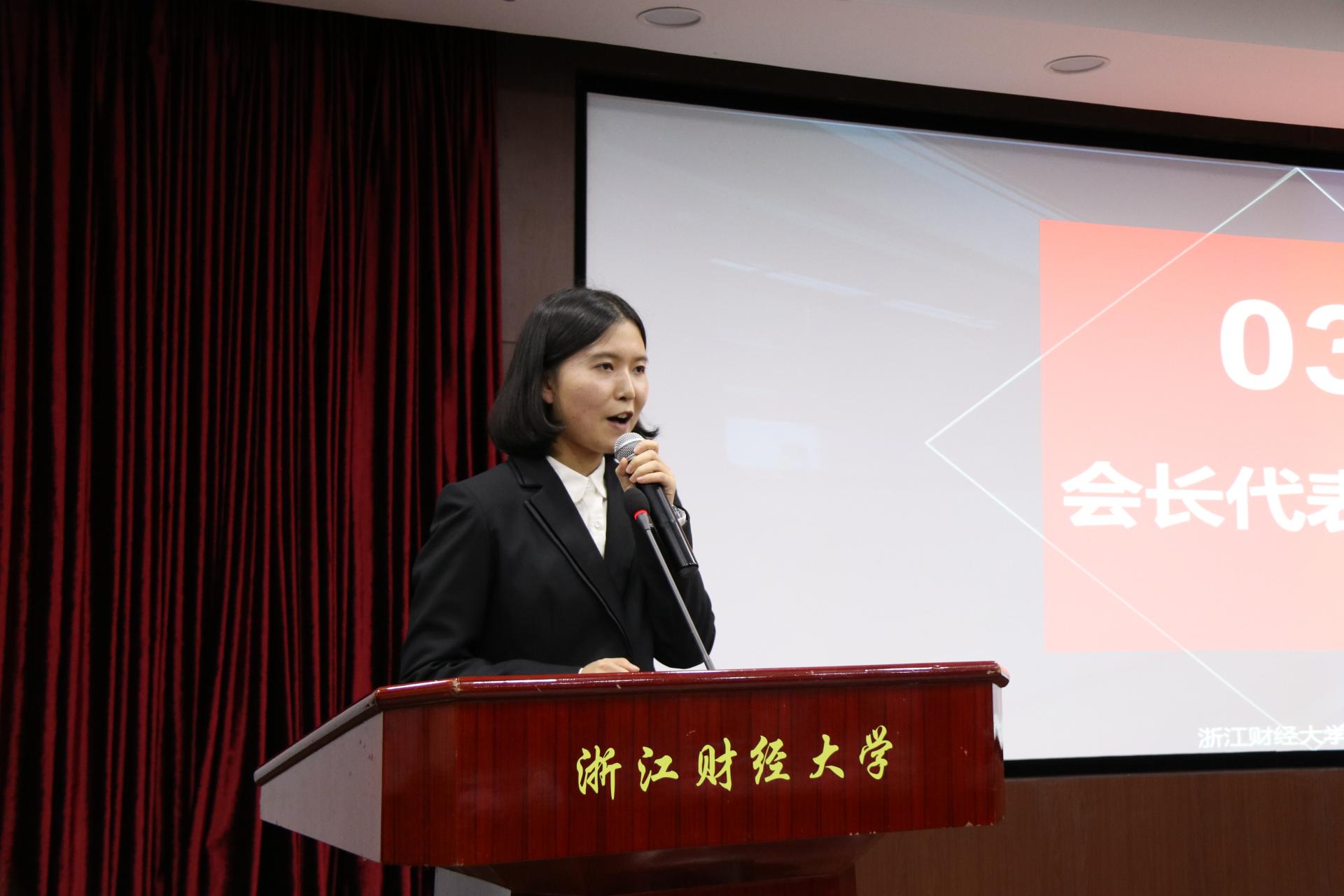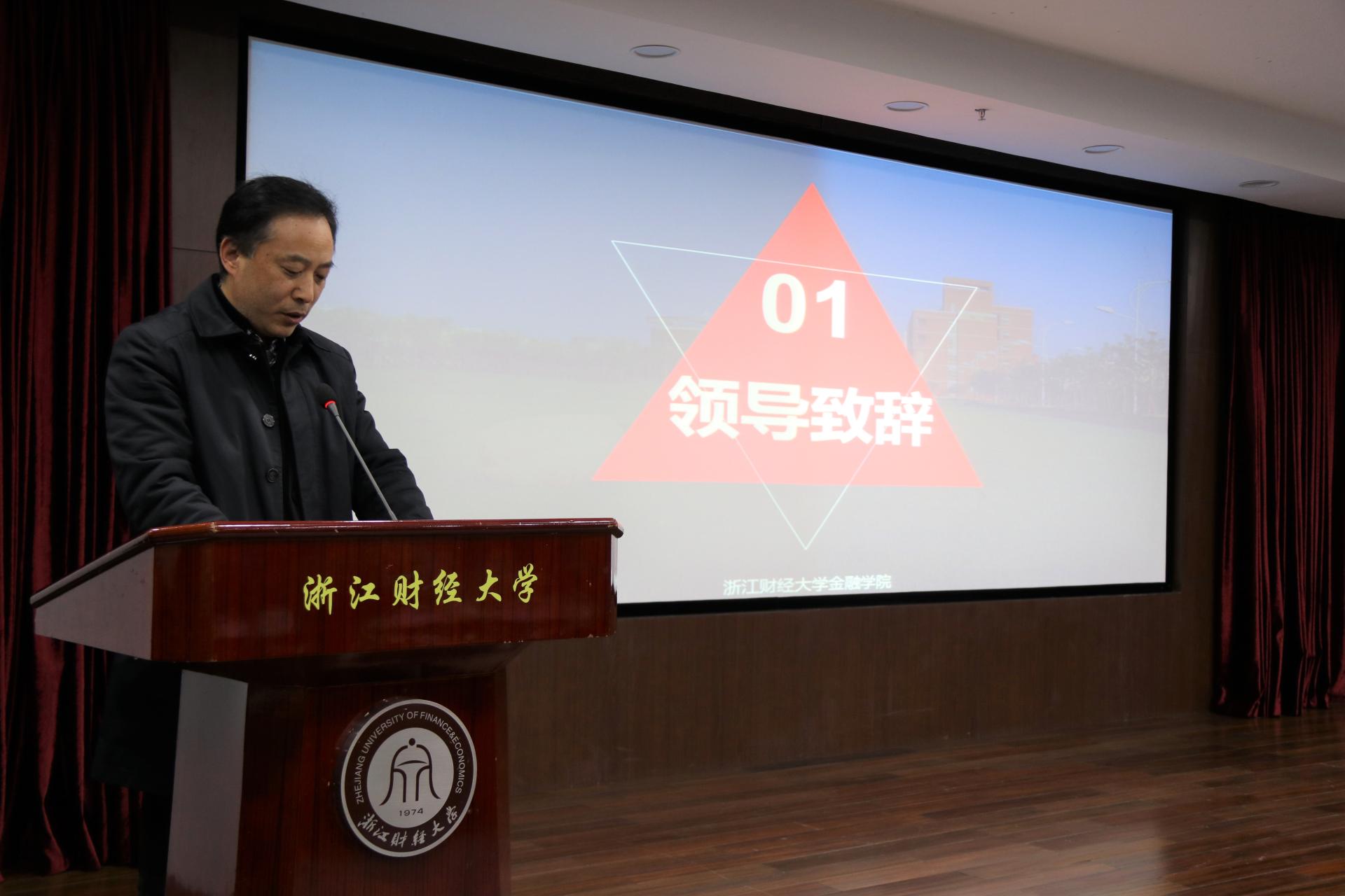 活动进入第二环节。首先由我院党委书记蔡国金致辞,对我院学术型社团历经二十多年的建设和发展并取得的出色成果表示肯定,对未来我院学术型社团的建设表达了自己的期望。接着金融工程学会指导老师钟立新发言,通过鼓励各学会摄入创新、实践、坚持,努力的理念,将我院的社团建设推广至社会。国际交流学会会长王书杰、信用管理学会会长刘枞上台,就学会概况、学会的未来发展等方面作了讲话。最后金融学会代表徐丽帅上台发言,她介绍了金融学会作为我院的金牌社团,举办的省赛吸引了校内校外学生的踊跃参与,并对社团的建设提出了一些自己的看法。