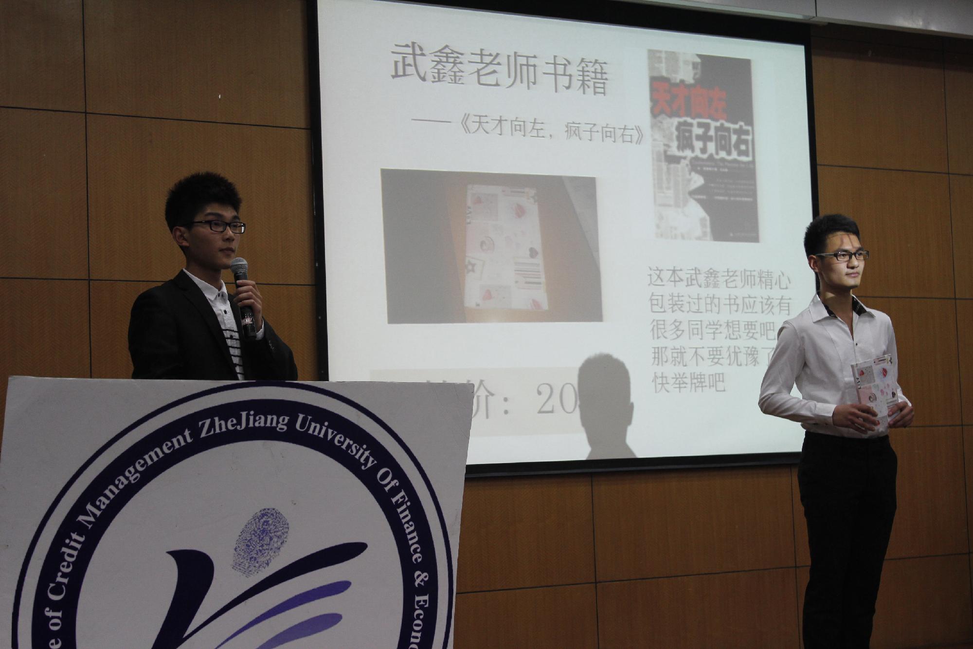 本次拍卖会还拿出几件神秘拍品。“金融第一帅” 武鑫 老师提供了一本自己亲手包装的书籍——《天才在左,疯子在右》。这件拍品激起了学子们极大的兴趣,大家都希望能拍下书籍表示对拍卖会以及 武鑫 老师的支持。现场的学生们一听完介绍,纷纷毫不犹豫地举牌,最终书籍以两倍于起步价的价格成交。为了助力大家的学业,信管学会还特意准备了“学霸套餐”。拍下本套餐的同学可以享受一名学霸的数学辅导,内容可选择微积分、线性代数和概率论。在激烈的争拍中,好学的97号竞拍者以高价拍得该套餐。这样的惊喜似乎还不够,“院花”毛琼的一组私密照也赫然出现在拍品之中。为了不让院花即前任会长照片外流,金融学会现会长张倬男参与了激烈的竞拍,最终却不敌现场毛琼的男粉丝。之后毛琼对拍品做了一段描述,并和拍下私密照的男粉丝亲密合影留念。