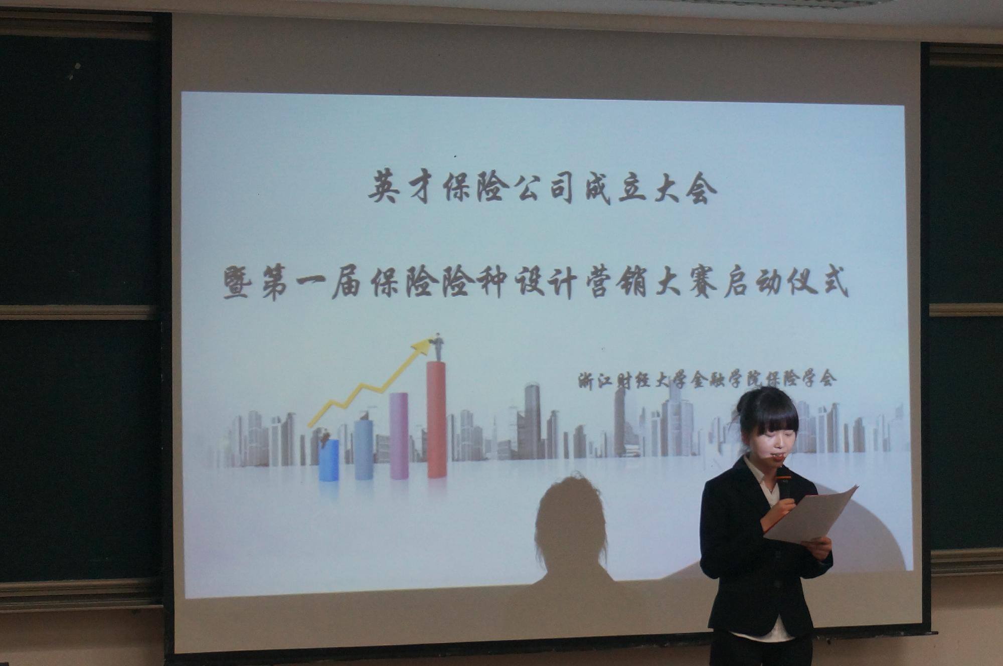 4月17日晚19:00,英才保险公司成立大会暨第一届保险险种设计营销大赛活动启动仪式在金融学院102教室隆重举行。本次大会由保险学会举办,天安财产保险公司杭州中心支公司张文春总经理、保险学会指导老师叶晓凌老师、金融学院辅导员尹怀玉老师以及金融学院团委学生会代表及各学会社团代表参加了大会。