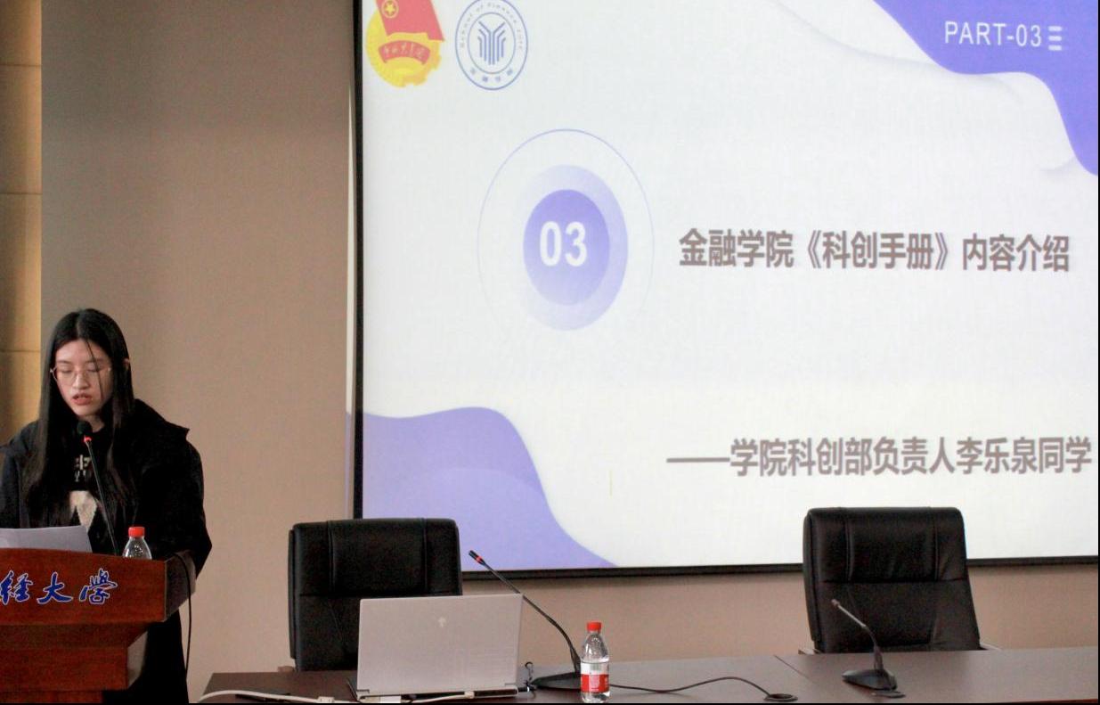 2023年12月13日下午,学院于202报告厅举办了2023年度金融学院科创手册讲解会,会议由科创部陈瑾涵主持,科创部负责人李乐泉同学主讲。