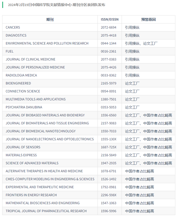 2月19日,中科院文献情报中心发布了2024年《国际期刊预警名单》,现予以转发。