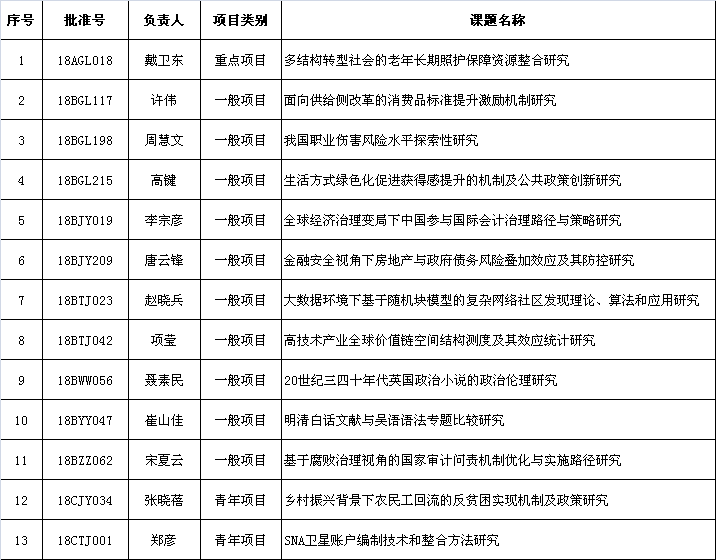 近日,2018年度国家社会科学基金年度项目和青年项目评审结果正式公布,我校共有13个项目获批准立项。其中,重点项目1项,一般项目10项,青年项目2项。