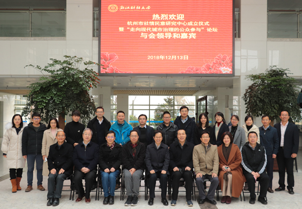 12月13日,由我校与杭州市决策咨询委员会办公室主办的杭州市社情民意研究中心成立仪式暨“走向现代城市治理的公众参与”论坛在我校下沙校区举行。来自全省高校、科研院所、政府、媒体机构的30余位领导嘉宾、专家学者、媒体代表等出席成立仪式。